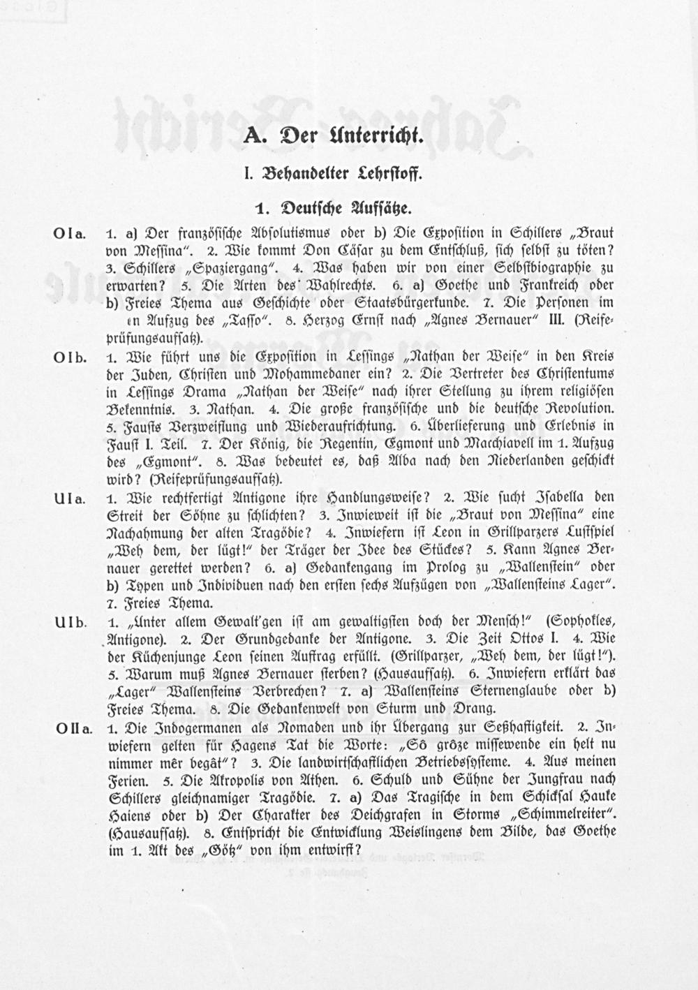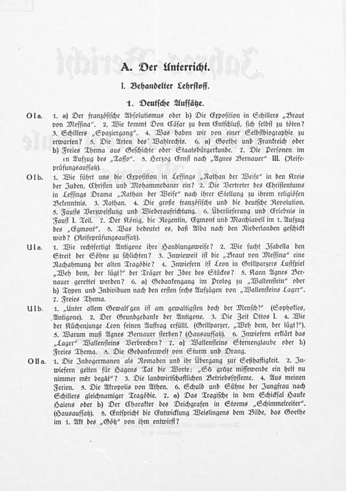 1. a) Der franzöſiſche Abſolutismus oder b) Die Expoſition in Schillers„Braut von Meſſina“. 2. Wie kommt Don Cäſar zu dem Entſchluß, ſich ſelbſt zu töten? 3. Schillers„Spaziergang“. 4. Was haben wir von einer Selbſtbiographie zu erwarten? 5. Die Arten des Wahlrechts. 6. a) Goethe und Frankreich oder b) Freies Thema aus Geſchichte oder Staatsbürgerkunde. 7. Die Perſonen im en Aufzug des„Taſſo“. 8. Herzog Ernſt nach„Agnes Bernauer“ III.(Reife⸗ prüfungsaufſatz). 1. Wie führt uns die Expoſition in Leſſings„Nathan der Weiſe“ in den Kreis der Juden, Chriſten und Mohammedaner ein? 2. Die Vertreter des Chriſtentums in Leſſings Drama„Nathan der Weiſe“ nach ihrer Stellung zu ihrem religiöſen Bekenntnis. 3. Nathan. 4. Die große franzöſiſche und die deutſche Revolution. 3. Fauſts Verzweiflung und Wiederaufrichtung. 6. Lberlieferung und Erlebnis in Fauſt J. Teil. 7. Der König, die Regentin, Egmont und Macchiavell im 1. Aufzug des„Egmont“. 8. Was bedeutet es, daß Alba nach den Niederlanden geſchickt wird?(Reifeprüfungsaufſatz). 1. Wie rechtfertigt Antigone ihre Handlungsweiſe? 2. Wie ſucht Iſabella den Streit der Söhne zu ſchlichten? 3. Inwieweit iſt die„Braut von Meſſina“ eine Nachahmung der alten Tragödie? 4. Inwiefern iſt Leon in Grillparzers Luſtſpiel „Weh dem, der lügt!“ der Träger der Idee des Stückes? 5. Kann Agnes Ber⸗ nauer gerettet werden? 6. a) Gedankengang im Prolog zu„Wallenſtein“ oder b) Topen und Individuen nach den erſten ſechs Aufzügen von„Wallenſteins Lager“. 7. Freies Thema.. 1.„Unter allem Gewalt'gen iſt am gewaltigſten doch der Menſch!“(Sophokles,