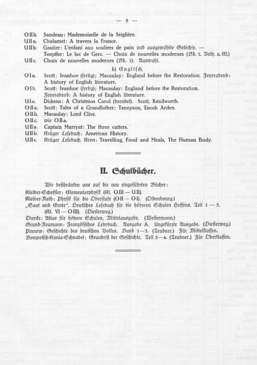Kleiber⸗Scheffler: Elementarphoſik(Kl. OIII— UIh. Kleiber⸗Nath: Phoſik für die Oberſtufe(OlI— Ol).(Oldenbourg.) „Saat und Ernte“. Deutſches Leſebuch für die höheren Schulen Heſſens, Teil 1— 3. (Kl. V— OlIIh.(Dieſterweg.) Diercke: Atlas für höhere Schulen, Mittelausgabe.(Weſtermann.) Grund⸗Neumann: Franzöſiſches Lehrbuch. Ausgabe A. Angekürzte Ausgabe.(Dieſterweg.) Pinnow: Geſchichte des deutſchen Volkes. Band 1—3.(Teubner.) Für Mittelklaſſen. Bonwetſch⸗Kania⸗Schnabel: Grundriß der Geſchichte. Teil 2— 4.(Teubner.) Für Oberklaſſen.