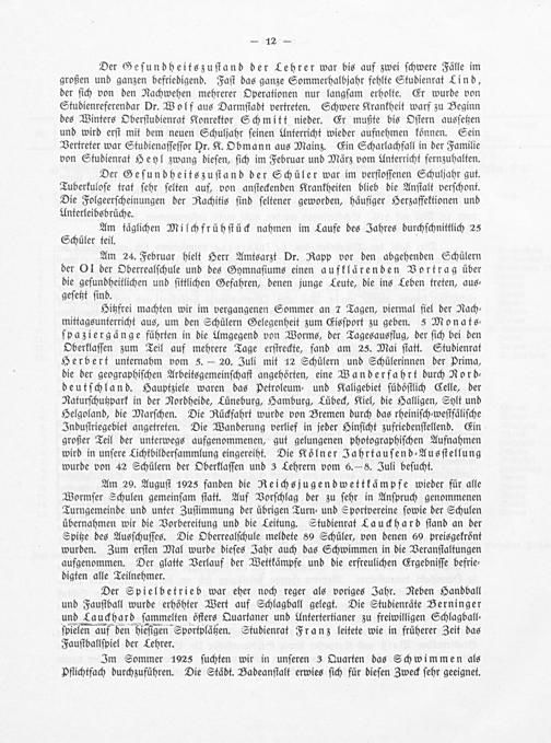 Der Geſundheitszuſtand der Lehrer war bis auf zwei ſchwere Fälle im großen und ganzen befriedigend. Faſt das ganze Sommerhalbjahr fehlte Studienrat Lind, der ſich von den Nachwehen mehrerer Operationen nur langſam erholte. Er wurde von Studienreferendar Dr. Wolf aus Darmſtadt vertreten. Schwere Krankheit warf zu Beginn des Winters Oberſtudienrat Konrektor Schmitt nieder. Er mußte bis Oſtern ausſetzen und wird erſt mit dem neuen Schuljahr ſeinen Anterricht wieder aufnehmen können. Sein Vertreter war Studienaſſeſſor Dr. K. Obmann aus Mainz. Ein Scharlachfall in der Familie von Studienrat Heol zwang dieſen, ſich im Februar und März vom Anterricht fernzuhalten.