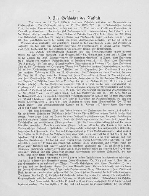 Wir traten am 19. April 1926 in das neue Schuljahr mit einer auf 26 verminderten Klaſſenzahl ein. Die Schülerzahl betrug am 15. Mai 1926 777. Herr Studienaſſeſſor Ludwig Betz, der außer Verwendung kam, verließ uns am 10. Mai, um eine Stelle am Gymnaſium in Detmold zu übernehmen. Im übrigen ſind AÄnderungen in der Zuſammenſetzung des Lehrkörpers der Anſtalt nicht zu verzeichnen. Herr Studienrat Heinrich Lauckhard, der ſchon am 20. März ſeine Urlaubsreiſe nach den Vereinigten Staaten von Nordamerika angetreten hatte, von der er am 20. Juni zurückkehrte, wurde bereitwillig von ſeinen Amtsgenoſſen vertreten. Er hat ſich in dieſen 3 Monaten einen wertvollen und gründlichen Einblick in das amerikaniſche Turn⸗ und Sportweſen verſchafft, von dem wir eine beſondere Förderung der Leibesübungen an unſerer Anſtalt erhoffen. Das Heſſ. Landesamt für das Bildungsweſen gewährte Urlaub und Unterſtützung.