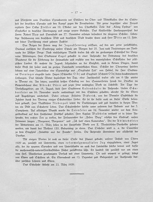 Den Reigen der Feiern mag der Jugendfeiertag eröffnen, auf den wir gerne zurückblicken. Diesmal entführte der Sonderzug unſere Schule am Morgen des 25. Juni nach Neuleiningen am Nord⸗ rande der Pfälzer Berge. Nach einſtündigem Marſch trafen ſich alle im geräumigen Schloßhof der Burg⸗ ruine Altleiningen. Herr Studienrat Engel gedachte in einer Anſprache der Bedeutung des deutſchen Wanderns für die Förderung der Heimatliebe und erzählte von den mannigfachen Schickſalen des pfäl⸗ ziſchen Landes. Er mahnte die Jugend, feſtzuhalten an der Einigkeit, auch in kleinen Dingen, damit dieſer Geiſt ſich ſpäter auch im großen Vaterlande verwirklichen könne. Schüler der Oberprima ſpielten ſodann auf einer Naturbühne eine Szenenfolge aus„Siegfrieds Tod“ von Hebbel, die Herr Studien⸗ rat Berninger eingeübt hatte. Hagen(Schneider O Ic) und Siegfried(Schmitt O Ia) boten beachtenswerte Leiſtungen. Das ſchönſte Wetter begünſtigte den Tag, ohne Zwiſchenfall trafen alle um 6 Uhr wieder in Worms ein. Am letzten, unendlich heißen Schultag vor den Sommerferien ſprach der Direktor im Gemeindehaus über Albrecht Dürer und zeigte ſeine wichtigſten Werke im Lichtbild. Am Tage der Verfaſſungsfeier, am 18. Auguſt, hielt Herr Studienrat Kaltenhäuſer die Anſprache. Unſere Schu⸗ bertfeier am 16. November wurde nachmittags mit den Schülern gehalten, abends für die Eltern und Angehörigen wiederholt. Dabei erfreute Fräulein Bickerich, von der Wormſer Stadtſchule die Zuhörer durch den Vortrag einiger Schubertſcher Lieder. Es ſei ihr dafür auch an dieſer Stelle beſon⸗ ders gedankt. Herr Muſiklehrer Niebergall leitete die Darbietungen und gab daneben in kurzen Wor⸗ ten ein Bild von Schuberts Leben. Das Schulorcheſter ſpielte unter anderem das Andante aus der 5. Symphonie. Auf allſeitigen Wunſch wurde die Totenfeier am 24. November wieder vor dem Krie⸗ gerdenkmal auf dem Hochheimer Friedhof gehalten. Herr Kaplan Waldhelm verſtand es in ſeiner An⸗ ſprache, den rechten Ton zu treffen, der Poſaunenchor der„Feſten Burg“ erhöhte den Eindruck, unſere Primaner ſangen„Morgenrot, Morgenrot“ und„Ich hatt einen Kameraden“. Bei der Abſchiedsfeier der Abiturienten am 11. März ſollen in der Hauptſache Werke von F. Mendelsſohn⸗Bartholdy geboten werden, um damit des Meiſters 120. Geburtstag zu ehren. Das Orcheſter wird u. a. die Ouvertüre zu dem Singſpiel„Heimkehr aus der Fremde“ ſpielen. Die Anſprache übernimmt wie alljährlich der Direktor.