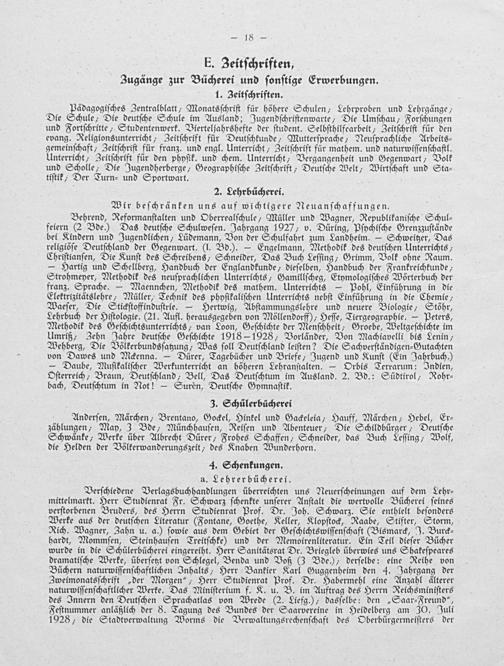 Behrend, Reformanſtalten und Oberrealſchule, Müller und Wagner, Republikaniſche Schul⸗ feiern(2 Bde.) Das deutſche Schulweſen. Jahrgang 1927, v. Düring, Pſychiſche Grenzzuſtände bei Kindern und Jugendlichen, Lüdemann, Von der Schulfahrt zum Landheim.— Schweitzer, Das religiöſe Deutſchland der Gegenwart.(l. Bd.).— Engelmann, Methodik des deutſchen Unterrichts, Chriſtianſen, Die Kunſt des Schreibens, Schneider, Das Buch Leſſing, Grimm, Volk ohne Raum. — Hartig und Schellberg, Handbuch der Englandkunde, dieſelben, Handbuch der Frankreichkunde, Strohmeyer, Methodik des neuſprachlichen Unterrichts, Gamillſcheg, Etymologiſches Wörterbuch der franz. Sprache.— Maennchen, Methodik des mathem. Unterrichts— Pohl, Einführung in die Elektrizitätslehre, Müller, Technik des phyſikaliſchen Unterrichts nebſt Einführung in die Chemie, Waeſer, Die Stickſtoffinduſtrie.— Hertwig, Abſtammungslehre und neuere Biologie, Stöhr, Lehrbuch der Hiſtologie.(21. Aufl. herausgegeben von Möllendorff), Heſſe, Tiergeographie.— Peters, Methodik des Geſchichtsunterrichts, van Loon, Geſchichte der Menſchheit, Groebe, Weltgeſchichte im Umriß, Zehn Jahre deutſche Geſchichte 1918— 1928, Vorländer, Von Machiavelli bis Lenin, Wehberg, Die Völkerbundsſatzung, Was ſoll Deutſchland leiſten? Die Sachverſtändigen⸗Gutachten von Dawes und Mckenna.— Dürer, Tagebücher und Briefe, Jugend und Kunſt(Ein Jahrbuch.) — Daube, Muſtkaliſcher Werkunterricht an höheren Lehranſtalten.— Orbis Terrarum: Indien, Oſterreich, Braun, Deutſchland, Bell, Das Deutſchtum im Ausland. 2. Bd.: Südtirol, Rohr⸗ bach, Deutſchtum in Not!— Suren, Deutſche Gymnaſtik.