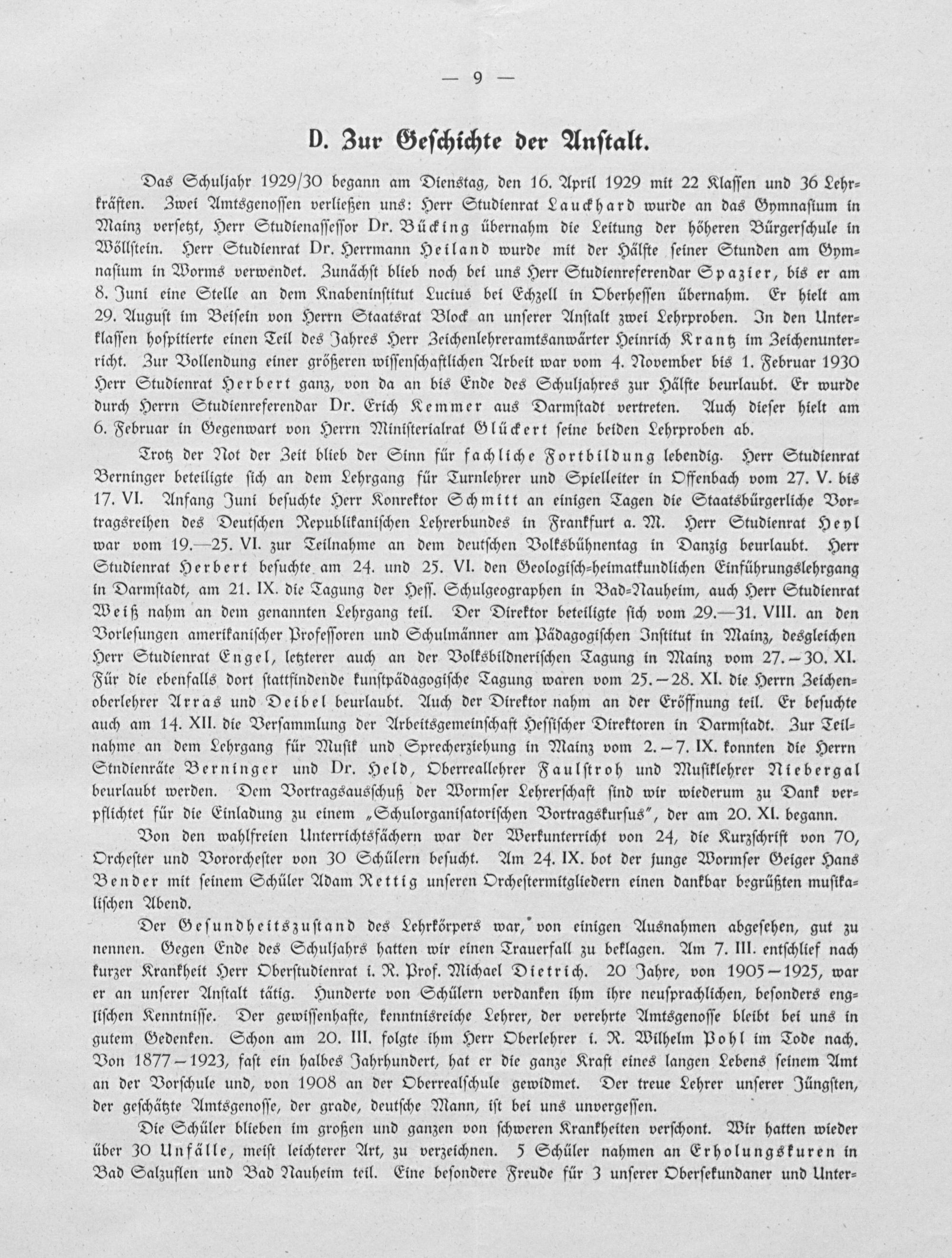 Das Schuljahr 1920/30 begann am Dienstag, den 16. April 1920 mit 22 Klaſſen und 36 Lehr⸗ kräften. Zwei Amtsgenoſſen verließen uns: Herr Studienrat Lauckhard wurde an das Gymnaſium in Mainz verſetzt, Herr Studienaſſeſſor Dr. Bücking übernahm die Leitung der höheren Bürgerſchule in Wöllſtein. Herr Studienrat Dr. Herrmann Heiland wurde mit der Hälfte ſeiner Stunden am Gym⸗ naſium in Worms verwendet. Zunächſt blieb noch bei uns Herr Studienreferendar Spazier, bis er am 8. Juni eine Stelle an dem Knabeninſtitut Lucius bei Echzell in Oberheſſen übernahm. Er hielt am 29. Auguſt im Beiſein von Herrn Staatsrat Block an unſerer Anſtalt zwei Lehrproben. In den Unter⸗ klaſſen hoſpitierte einen Teil des Jahres Herr Zeichenlehreramtsanwärter Heinrich Krantz im Zeichenunter⸗ richt. Zur Vollendung einer größeren wiſſenſchaftlichen Arbeit war vom 4. November bis 1. Februar 1930 Herr Studienrat Herbert ganz, von da an bis Ende des Schuljahres zur Hälfte beurlaubt. Er wurde durch Herrn Studienreferendar Dr. Erich Kemmer aus Darmſtadt vertreten. Auch dieſer hielt am 6. Februar in Gegenwart von Herrn Miniſterialrat Glückert ſeine beiden Lehrproben ab.