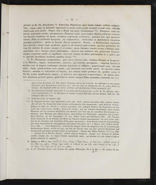 **) H. Sauppius brevibus iisque pulcerrimis verbis edit. Turic. adiectis non multo aliter cogitare videtur: „So soll also das Symposium keine einzelne philosophische Idee aussprechen, auch Sokrates Verherr- lichung ist nicht der Zweck:— sondern gegenüber dem nichtigen Treiben der Gegenwart soll das, worin das wahre Leben bestehe, dargestellt werden, und die wirkliche Erscheinung dieses idealen Menschen soll die schwachen Sterblichen zum Streben nach dem nun als erreichbar Erscheinenden er- muntern: Also Mahnung zum wahren Leben, zum Studium der Philosophie, gegenüber dem gewöhn- lichen Treiben, ist das Symposium.“ F. Ast., Platos Leben und Schriften p. 309:„Die Tendenz dieses Gesprächs ist am Schlusse der Rede des Sokrates deutlich ausgesprochen, die ächte Liebe näm- lich als die lebendige und unsterbliche Philosophie darzustellen, deren Zweck wahrhafte Tugendbildung und deren Gegenstand die unvergängliche überirdische Schönheit ist.“ I. Socher über Platons Schrif- ten p. 335:—„Sein Hauptzweck, welchem die übrigen Theile des Gesprächs blos als heraushebende Schattenseiten dienen, scheint zu sein, uns mit der Theorie einer von aller gröberen Sinnlichkeit und Leidenschaft gereinigten geistigen Liebe zu beschenken.“ Heusde Init. Philos. Platonic. Vol. I. p. 168: —„Exstant illa in Phaedro maxime, subinde etiam in Symposio: uterque vero dialogus eo maxime consilio scriptus est, ut vulgari Uranius opponeretur amor, qui proxime est cum virtute et pulcro morali coniunctus et cognatus.“