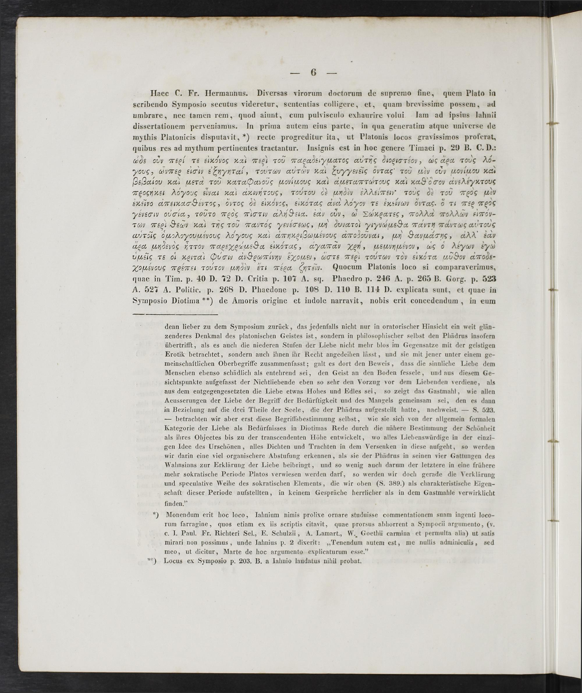 Ilaec C. Fr. Ilermannus. Diversas virorum doctorum de supremo fine, quem Plato in scribendo Symposio secutus videretur, sententias colligere, et, quam brevissime possem, ad umbrare, nec tamen rem, quod aiunt, cum pulvisculo exhaurire volui lam ad ipsius lahnii dissertationem perveniamus. In prima autem eius parte, in qua generatim atque universe de mythis Platonicis disputavit,*) recte progreditur ita, ut Platonis locos gravissimos proferat, quibus res ad mythum Nertinchltes tractantur. Insignis est in hoc genere Timaei p. 29 B. C. D:: 6 ε odv xsol 75 eixdoς l mε⁹½ 100 Taνeειμeos auτ*ε ⁰oεiε réon, dc Aoa rodc A6- Novg, aue³ 2 2enynral, Tou υν χντσν ν, Ve uας το νν ν ονμν m Osalons vd, usra rol, nara Sauos⁵ Aauideus al Ausrar aou 22 24.9 5 dσον½ õελεν νυνεονςσ Téοε Ʒ½ As⁴ονσσ glvas na azume v5, T00,9 Lnd² SAAsi sivJ ro0⁶ 9 7⁰0 TG Lu 2.uεε νο Aεαυι‿εέκτmν, 2*rog D eiadveg, eiuo⁴a dud A„ Ts Eε1GO dvrTag. 6 71 xs 2ο⁸ Peusiu ouσia, r0⁵ο T6 A To ru aAA⁴μ α☛ᷣ ςεα. 2Aν 102, d Sdzeœrs, ToAAa enAASN eir2- raν eενε Jeν uε 00 Tarrog Teueαε, u DuAτ Twysuεe xdur Tdrοςαatε aντνi* duνeπηꝙουμeνuς AM⁴ οuς E aAaνννοραμέννοι d2ea, un gaudang, Aμ‿ 2dy deu Lndeog Tτν πάαοε Xodᷣu awöras, ayarν Xen, sνnεενον, 26 ⁴ Asyν 8„ ULeig 78 0l eura! Ouεν drνᷣεορνπτννννερν̈οομέπνQ, d εενqmτντν ον siuda 0 or Aοdso Voueroug Tε,ει rouoν undeu er4 xeed Ohrsu. Quocum Platonis loco si comparaverimus, quae in Tim. p. 40 D. 72 D. Critia p. 107 A. sq. Phaedro p. 246 A. p. 265 B. Gorg. p. 523 A. 527 A. Politic. p. 268 D. Phaedone p. 108 D. 110 B. 114 D. explicata sunt, et quae in Symposio Diotima**†) de Amoris origine et indole narravit, nobis erit concedendum, in eum