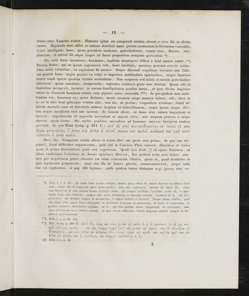 Ilic vero Amor incantator, fascinator, sophista magnopere differt a boni amoris indole.**) Etenim homo, qui se ipsum cognoscere vult, bene intelligit, quantum praestet ceteris anima- libus animi virtutibus, et sapientiae fit amator. Itaque discendi cupiditate incensus non falla- cia quaerit bona: neque pendet ex vulgi et imperitae multitudinis opinionibus, neque homines tenere cupit specie quadam virtutis assimulatae. Non corporea sed animi et mentis pulcritudine oblectatur, quam sanctitate, temperantia, sapientia contineri plane non qubitat. Quam ubi in hominibus perspexit, laetatur: in eorum-familiaritatem penitus intrat, net ipse divino impletus amore in eiusmodi hominum animis eum gignere enixe contendit.***) In quo quidem non omit- tendum est, hominem ca, quam diximus, mente ornatum saepe numero dolere, sibi, licet in se et in aliis boni pulcrique semina alat, non ita, ut gestiat, respondere eventum: sentit ni- mirum mortalis suae et deterioris naturae inopiam et imbecillitatem, seque ipsum neque divi- tem neque mendicum esse non ignorat. At tantum abest, ut bona eius natura longuescat et haereat, impedimenta ei opposita accendunt et augent vires, nec unquam prorsus a scopo aberrat, quem tuetur. Sic multis gradibus ascendens ad humanae naturae fastigium tandem pervenit, de quo Plato Symp. p. 211. C.: 2ꝓ ϑ ϑμ ꝛ—äa-nudroν ε ĩeκ‿έ̈ ο μ- Snua rasuντiαν, ¶&iν οουνι ρννOοOFBHmH)Aυαυοιν εναεl νυι τον ³⁵‿ Aaduᷣ aa pue aure reAeurαν εέαν ᷣα⁵ςν.