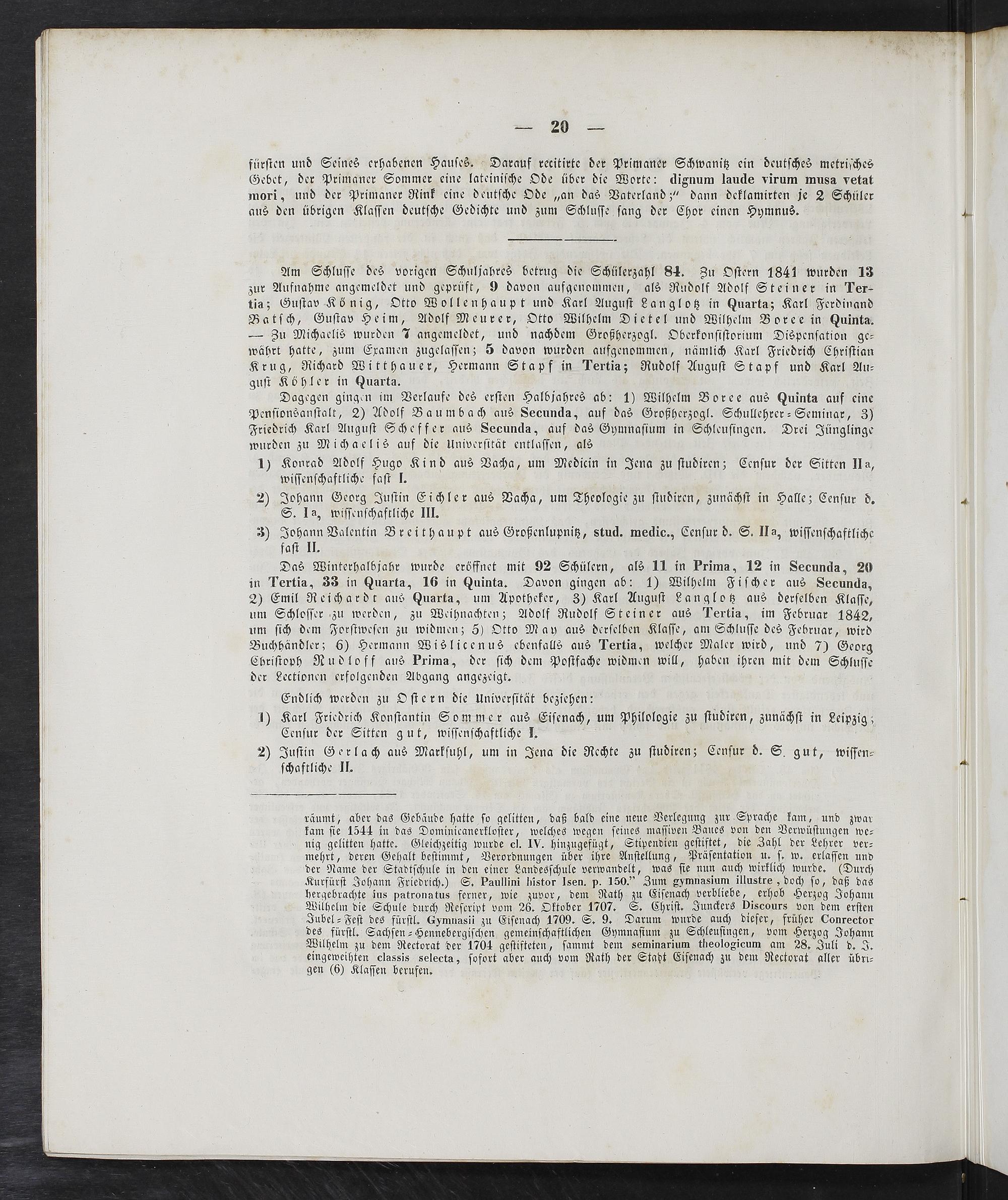 Das Winterhalbjahr wurde eröffnet mit 92 Schülern, als 11 in Prima, 12 in Secunda, 20 in Tertia, 33 in Quarta, 16 in Quinta. Davon gingen ab: 1) Wilhelm Fiſcher aus Secunda, 2) Emil Reichardt aus Quarta, um Apotheker, 3) Karl Auguſt Langlotz aus derſelben Klaſſe, um Schloſſer zu werden, zu Weihnachten; Adolf Rudolf Steiner aus Tertia, im Februar 1842, um ſich dem Forſtweſen zu widmen; 5) Otto May aus derſelben Klaſſe, am Schluſſe des Februar, wird Buchhändler; 6) Hermann Wislicenus ebenfalls aus Tertia, welcher Maler wird, und 7) Georg Chriſtoph Rudloff aus Prima, der ſich dem Poſtfache widmen will, haben ihren mit dem Schluſſe der Lectionen erfolgenden Abgang angezeigt.