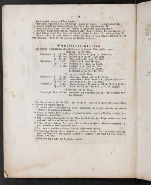 Schulfeierlichkeiten. Die öffentliche Hauptprüfung aller Klaſſen wird in folgender Weiſe gehalten werden: Montag, am 25. März: Vormittags 8— 9 Uhr: Religion in I und II, Prof. Dr. Weißenborn, 8— 10 1 Uhr: Religion in III und IV, Diak. Kohl, 10 ½— 11 Uhr: Mathematik in III, Prof. Dr. Mahr. Nachmittags 2— 2 ½ Uhr: Geſchichte in I, Prof. Dr. Rein, 2 ½— 3 Uhr: Geſchichte in II, Prof. Dr. Wittich, 3— 5 Uhr: Geſchichte in III, Prof. Dr. Rein, Geſchichte in IV, Prof. Dr. Wittich, Mathematik in IV, Prof. Dr. Mahr. Dienstag, am 26. März: Vormittags 8— 9 Uhr: Thucydides, Horat. satir. in I, Direktor,. 9— 10 ½ Uhr: Homeri Ilias u. Virgil. Aeneis in II, Prof. Dr. Weißenborn, 10 ½— 11 Uhr: Mathematik in II, Prof. Dr. Mahr.. Nachmittags 2.— 3 ½ Uhr: Xenoph. Anabas. u. Cic. orat. pro Sulla in III, Prof. Dr. Rein, 3 ½— 5 Uhr: Griech. Leſebuch und Caes. b. G. in IV, Dr. Witzſchel. Mittwoch, am 27. März: Vormittags 8— 10 Uhr: Griechiſches und Lateiniſches Leſebuch, dann Geſchichte in V, Dr. Schwanitz.