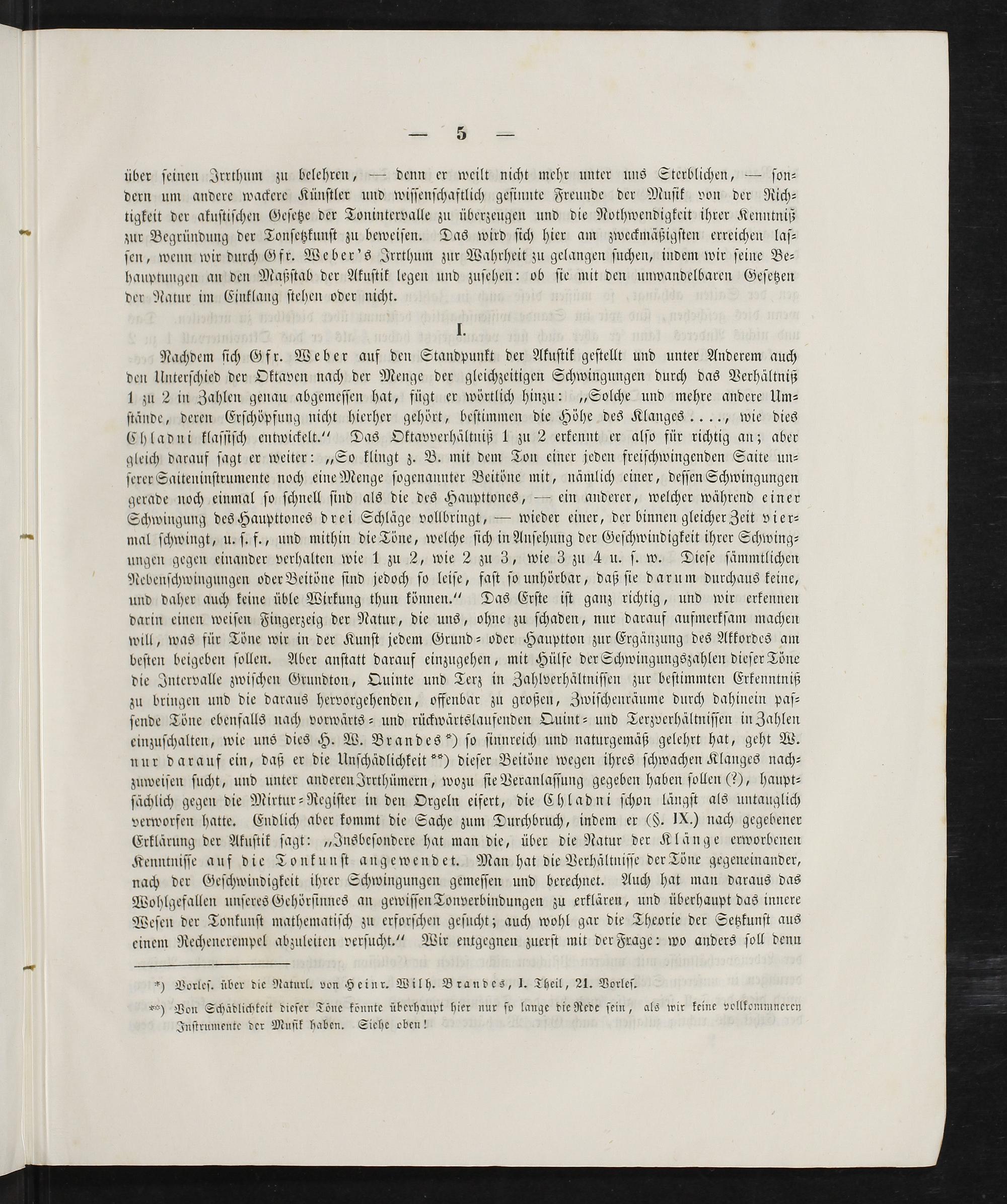 Nachdem ſich Gfr. Weber auf den Standpunkt der Akuſtik geſtellt und unter Anderem auch den Unterſchied der Oktaven nach der Menge der gleichzeitigen Schwingungen durch das Verhältniß 1 zu 2 in Zahlen genau abgemeſſen hat, fügt er wörtlich hinzu:„Solche und mehre andere Um⸗ ſtände, deren Erſchöpfung nicht hierher gehört, beſtimmen die Höhe des Klanges...., wie dies Chladni klaſſiſch entwickelt.“ Das Oktavverhältniß 1 zu 2 erkennt er alſo für richtig an; aber gleich darauf ſagt er weiter:„So klingt z. B. mit dem Ton einer jeden freiſchwingenden Saite un⸗ ſerer Saiteninſtrumente noch eine Menge ſogenannter Beitöne mit, nämlich einer, deſſen Schwingungen gerade noch einmal ſo ſchnell ſind als die des Haupttones,— ein anderer, welcher während einer Schwingung des Haupttones drei Schläge vollbringt,— wieder einer, der binnen gleicher Zeit vier⸗ mal ſchwingt, u. ſ. f., und mithin die Töne, welche ſich in Anſehung der Geſchwindigkeit ihrer Schwing⸗ ungen gegen einander verhalten wie 1 zu 2, wie 2 zu 3, wie 3 zu 4 u. ſ. w. Dieſe ſämmtlichen Nebenſchwingungen oder Beitöne ſind jedoch ſo leiſe, faſt ſo unhörbar, daß ſie darum durchaus keine, und daher auch keine üble Wirkung thun können.“ Das Erſte iſt ganz richtig, und wir erkennen darin einen weiſen Fingerzeig der Natur, die uns, ohne zu ſchaden, nur darauf aufmerkſam machen will, was für Töne wir in der Kunſt jedem Grund⸗ oder Hauptton zur Ergänzung des Akkordes am beſten beigeben ſollen. Aber anſtatt darauf einzugehen, mit Hülfe der Schwingungszahlen dieſer Töne die Intervalle zwiſchen Grundton, Quinte und Terz in Zahlverhältniſſen zur beſtimmten Erkenntniß zu bringen und die daraus hervorgehenden, offenbar zu großen, Zwiſchenräume durch dahinein paſ⸗ ſende Töne ebenfalls nach vorwärts⸗ und rückwärtslaufenden Quint- und Terzverhältniſſen in Zahlen einzuſchalten, wie uns dies H. W. Brandes“⸗) ſo ſinnreich und naturgemäß gelehrt hat, geht W. nur darauf ein, daß er die Unſchädlichkeit**) dieſer Beitöne wegen ihres ſchwachen Klanges nach⸗ zuweiſen ſucht, und unter anderen Irrthümern, wozu ſie Veranlaſſung gegeben haben ſollen(?), haupt⸗ ſächlich gegen die Mirtur⸗Regiſter in den Orgeln eifert, die Chladni ſchon längſt als untauglich verworfen hatte. Endlich aber kommt die Sache zum Durchbruch, indem er(§. IX.) nach gegebener Erklärung der Akuſtik ſagt:„Insbeſondere hat man die, über die Natur der Klänge erworbenen Kenntniſſe auf die Tonkunſt angewendet. Man hat die Verhältniſſe der Töne gegeneinander, nach der Geſchwindigkeit ihrer Schwingungen gemeſſen und berechnet. Auch hat man daraus das Wohlgefallen unſeres Gehörſinnes an gewiſſen Tonverbindungen zu erklären, und überhaupt das innere Weſen der Tonkunſt mathematiſch zu erforſchen geſucht; auch wohl gar die Theorie der Setzkunſt aus einem Rechenerempel abzuleiten verſucht.“ Wir entgegnen zuerſt mit der Frage: wo anders ſoll denn