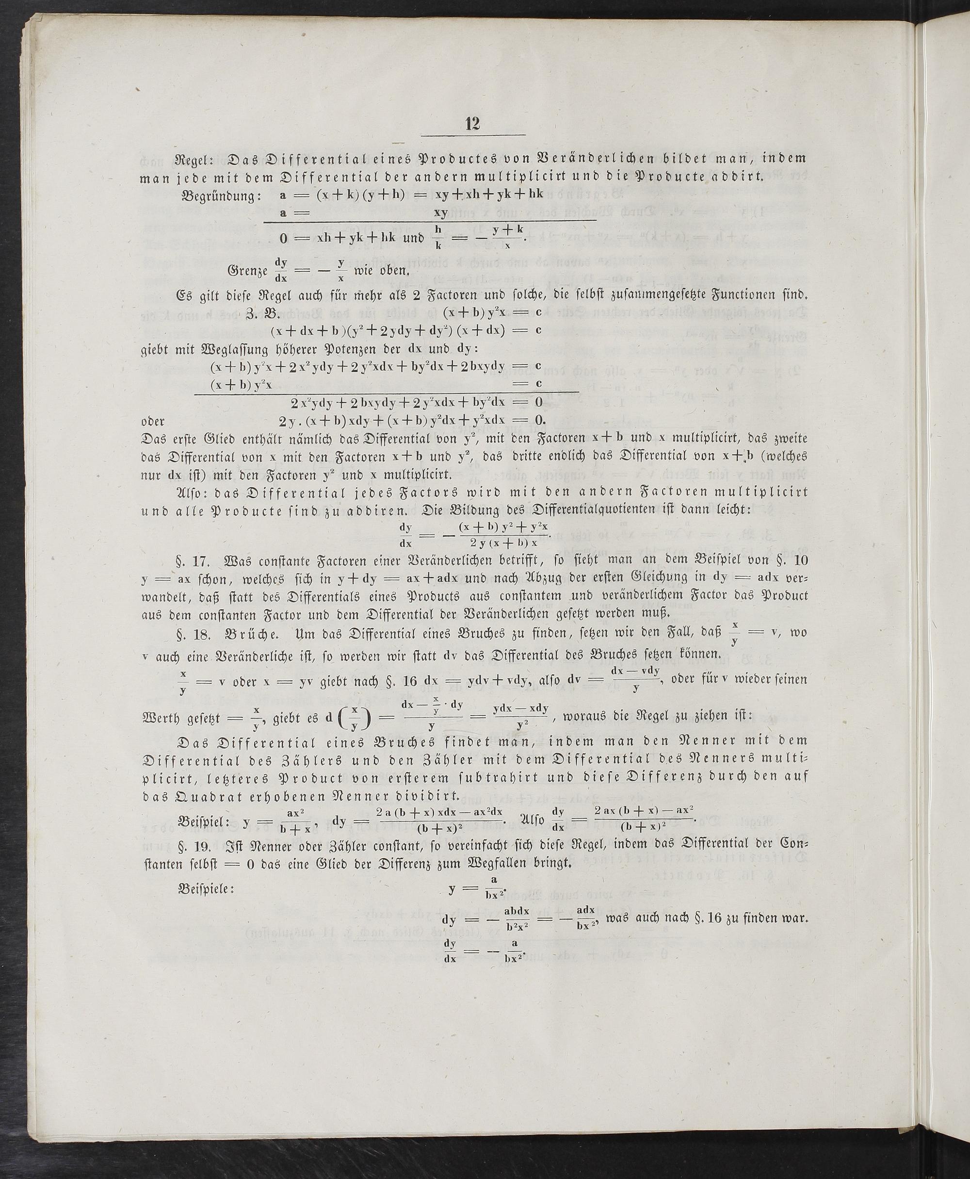 Das erſte Glied enthält nämlich das Differential von I, mit den Factoren b und x multiplicirt, das zweite das Differential von x mit den Factoren«ℳ b und y, das dritte endlich das Differential von X+ h(welches nur dx iſt) mit den Factoren y“ und x multiplicirt. Alſo: das Differential jedes Factors wird mit den andern Factoren multiplicirt und alle Producte ſind zu addiren. Die Bildung des Differentialquotienten iſt dann leicht: SFßä= e dx 2 y(X+ b) X §. 17. Was conſtante Factoren einer Veränderlichen betrifft, ſo ſieht man an dem Beiſpiel von§. 10 y= ax ſchon, welches ſich in y+ dy= ax+ adx und nach Abzug der erſten Gleichung in dy ä= adx ver⸗ wandelt, daß ſtatt des Differentials eines Products aus conſtantem und veränderlichem Factor das Product aus dem conſtanten Factor und dem Differential der Veränderlichen geſetzt werden muß. §. 18. Brüche. Um das Differential eines Bruches zu finden, ſetzen wir den Fall, daß 3= v, wo