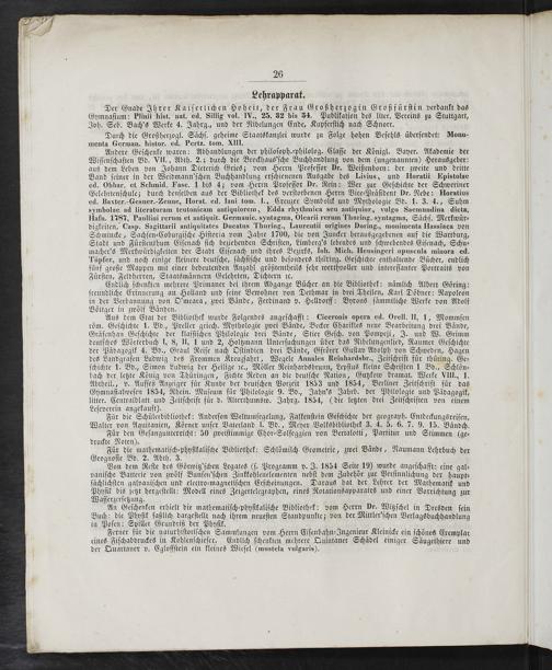 Aus dem Etat der Bibliothek wurde Folgendes angeſchafft: Ciceronis opera ed. Orell. I, 1, Mommſen röm. Geſchichte 1. Bd., Preller griech. Mythologie zwei Bände, Becker Charikles neue Bearbeitung drei Bände, Gräfenhan Geſchichte der klaſſiſchen Philologie drei Bände, Stier Geſch. von Pompeji, J. und W. Grimm deutſches Wörterbuch I, 8, II, 1 und 2, Holtzmann Unterſuchungen über das Nibelungenlied, Raumer Geſchichte der Pädagogik 4. Bd., Graul Reiſe nach Oſtindien drei Bände, Gfrörer Guſtav Adolph von Schweden, Hagen des Landgrafen Ludwig des Frommen Kreuzfahrt, Wegele Annales Reinhardsbr., Zeitſchrift für thüring. Ge⸗ ſchichte 1. Bd., Simon Ludwig der Heilige ꝛc., Möller Reinhardsbrunn, Lepſius kleine Schriften 1 Bd., Schlön⸗ bach der letzte König von Thüringen, Fichte Reden an die deutſche Nation, Gutzkow dramat. Werke Vlll., 1. Abtheil., v. Aufſeß Anzeiger für Kunde der deutſchen Vorzeit 1853 und 1854, Berliner Zeitſchrift für das Gymnaſiahveſen 1854, Rhein. Muſeum für Philologie 9. Bd., Jahn's Jahrb. der Philologie und Pädagogik, litter. Centralblatt und Zeitſchrift für d. Alterthumsw. Jahrg. 1854,(die letzten drei Zeitſchriften von einem Leſeverein angekauft).