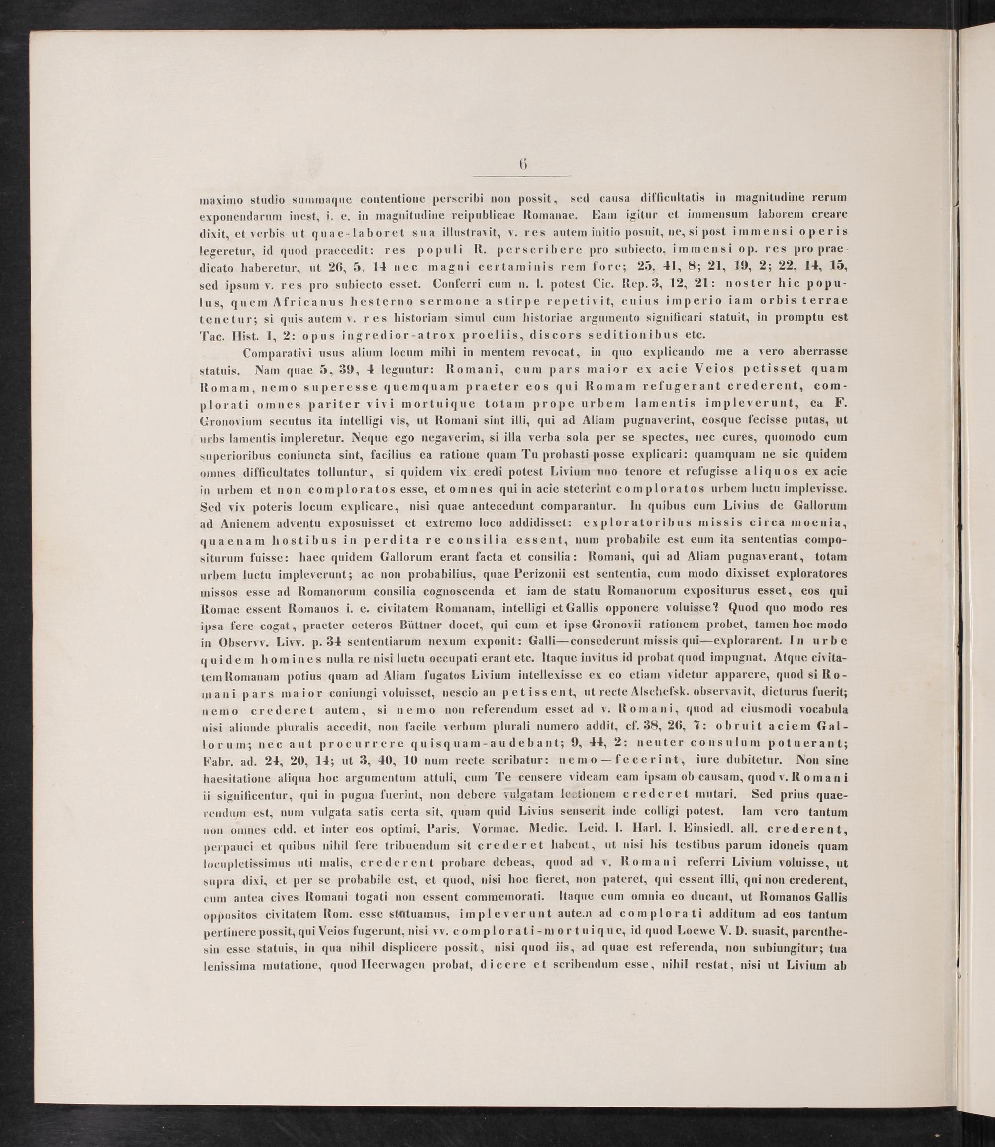 Comparativi usus alium locum mihi in mentem revocat, in quo explicando me a vero aberrasse statuis. Nam quae 5, 39, 4 leguntur: Romani, cum pars maior ex acie Veios petisset quam Romam, nemo superesse quemquam praeter eos qui Romam refugerant crederent, com- plorati omnes pariter vivi mortuique totam prope urbem lamentis impleverunt, ea F. Gronovium secutus ita intelligi vis, ut Romani sint illi, qui ad Aliam pugnaverint, eosque fecisse putas, ut urbs lamentis impleretur. Neque ego negaverim, si illa verba sola per se spectes, nec cures, quomodo cum superioribus coniuncta sint, facilius ea ratione quam Tu probasti posse explicari: quamquam ne sic quidem omnes difficultates tolluntur, si quidem vix credi potest Livium uno tenore et refugisse aliquos ex acie in urbem et non comploratos esse, et omnes qui in acie steterint comploratos urbem luctu implevisse. Sed vix poteris locum explicare, nisi quae antecedunt comparantur. In quibus cum Livius de Gallorum ad Anienem adventu exposuisset et extremo loco addidisset: exploratoribus missis circa moenia, quaenam hostibus in perdita re cousilia essent, num probabile est eum ita sententias compo- siturum fuisse: haec quidem Gallorum erant facta et consilia: Romani, qui ad Aliam pugnaverant, totam urbem luctu impleverunt; ac non probabilius, quae Perizonii est sententia, cum modo dixisset exploratores missos esse ad Romanorum consilia cognoscenda et iam de statu Romanorum expositurus esset, eos qui Romae essent Romanos i. e. civitatem Romanam, intelligi et Gallis opponere voluisse? Quod quo modo res ipsa fere cogat, praeter ceteros Büttner docet, qui cum et ipse Gronovii rationem probet, tamen hoc modo in Observv. Livv. p. 34 sententiarum nexum exponit: Galli— consederunt missis qui—explorarent. In urbe quidem homines nulla re nisi luctu occupati erant etc. Itaque invitus id probat quod impugnat. Atque civita- tem Romanam potius quam ad Aliam fugatos Livium intellexisse ex eo etiam videtur apparere, quod si Ro- mani pars maior coniungi voluisset, nescio an petissent, ut recte Alschefsk. observavit, dicturus fuerit; nemo crederet autem, si nemo non referendum esset ad v. Romani, quod ad eiusmodi vocabula nisi aliunde pluralis accedit, non facile verbum plurali numero addit, cf. 38, 26, 7: obruit aciem Gal- lorum; nec aut procurrere quisquam-audebant; 9, 414, 2: neuter consulum potuerant; Fabr. ad. 24, 20, 14; ut 3, 40, 10 num recte scribatur: nemo— fecerint, jure dubitetur. Non sine haesitatione aliqua hoc argumentum attuli, cum Te censere videam eam ipsam ob causam, quod v. Romani ii significentur, qui in pugna fuerint, non debere vulgatam leetionem crederet mutari. Sed prius quae- rendum est, num vulgata satis certa sit, quam quid Livius senserit inde colligi potest. lam vero tantum non omnes cdd. et inter eos optimi, Paris. Vormac. Medic. Leid. I. Harl. I. Einsiedl. all. crederent, perpauci et quibus nihil fere tribuendum sit crederet habent, ut nisi his testibus parum idoneis quam locupletissimus uti malis, crederent probare debeas, quod ad v. Romani referri Livium voluisse, ut supra dixi, et per se probabile est, et quod, nisi hoc fieret, non pateret, qui essent illi, qui non crederent, cum antea cives Romani togati non essent commemorati. Itaque cum omnia eo ducant, ut Romauos Gallis oppositos civitatem Rom. esse statuamus, impleverunt auteen ad complorati additum ad eos tantum pertinere possit, qui Veios fugerunt, nisi vv. complorati-mortuiquc, id quod Loewe V. D. suasit, parenthe- sin esse statuis, in qua nihil displicere possit, nisi quod iis, ad quae est referenda, non subiungitur; tua