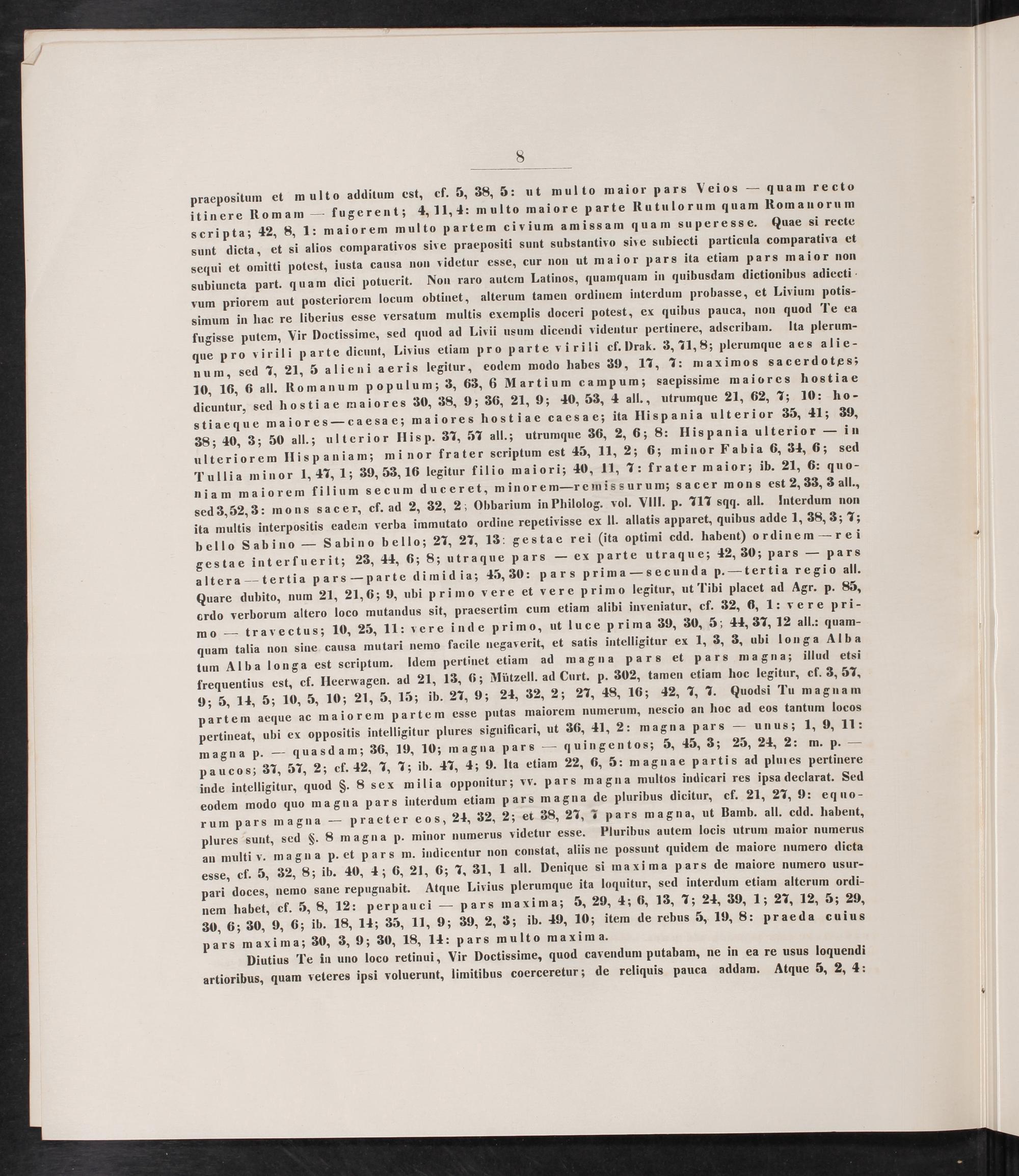 praepositum et multo additum est, cf. 5, 38, 5: ut multo maior pars Veios— quam recto itinere Romam— fugerent; 4, 11, 4: multo maiore parte Rutulorum quam Romanorum scripta; 42, 8, 1: maiorem multo partem civium amissam quam superésse. Quae si recte sunt dicta, et si alios comparativos sive praepositi sunt substantivo sive subiecti particula comparativa et sequi et omitti potest, iusta causa non videtur esse, cur non ut maior pars ita etiam pars maior non subiuncta part. quam dici potuerit. Non raro autem Latinos, quamquam in quibusdam dictionibus adiecti- vum priorem aut posteriorem locum obtinet, alterum tamen ordinem interdum probasse, et Livium potis- simum in hac re liberius esse versatum multis exemplis doceri potest, ex quibus pauca, non quod Te ea fugisse putem, Vir Doctissime, sed quod ad Livii usum dicendi videntur pertinere, adscribam. Ita plerum- que pro virili parte dicunt, Livius etiam pro parte virili cf. Drak. 3, 71, 8; plerumque aes alie- num, sed 7, 21, 5 alieni aeris legitur, eodem modo habes 39, 17, 7: maximos sacerdotes; 10, 16, 6 all. Romanum populum; 3, 63, 6 Martium campum; saepissime maiores hostiae dicuntur, sed hostiae maiores 30, 38, 9; 36, 21, 9; 40, 53, 4 all., utrumque 21, 62, 7; 10: ho- stiaeque maiores— caesae; maiores hostiae caesae; ita Hispania ulterior 35, 41; 39, 38; 40, 3; 50 all.; ulterior Hisp. 37, 57 all.; utrumque 36, 2, 6; 8: Hispania ulterior— in ulteriorem IHlispaniam; minor frater scriptum est 45, 11, 2; 6; minor Fabia 6, 34, 6; sed Tullia minor 1, 47, 1; 39, 53, 16 legitur filio maiori; 40, 11, 7: frater maior; ib. 21, 6: quo- niam maiorem filium secum duceret, minorem—remissurum; sacer mons est 2, 33, 3 all., sed 3, 52, 3: mons sacer, cf. ad 2, 32, 2; Obbarium in Philolog. vol. VIII. p. 717 sqq. all. Interdum non ita multis interpositis eadem verba immutato ordine repetivisse ex II. allatis apparet, quibus adde 1, 38, 3; 7; bello Sabino— Sabino bello; 27, 27, 13: gestae rei(ita optimi cdd. habent) ordinem—rei gestae interfuerit; 23, 44, 6; 8; utraque pars— ex parte utraque; 42, 30; pars— pars altera—tertia pars—parte dimidia; 45, 30: pars prima— secunda p.—tertia regio all. Quare dubito, num 21, 21, 6; 9, ubi primo vere et vere p rimo legitur, ut Tibi placet ad Agr. p. 85, ordo verborum altero loco mutandus sit, praesertim cum etiam alibi inveniatur, cf. 32, 6, 1: vere pri- mo— travectus; 10, 25, 11: vere inde primo, ut luce prima 39, 30, 5; 44, 37, 12 all.: quam- quam talia non sine causa mutari nemo facile negaverit, et satis intelligitur ex 1, 3, 3, ubi longa Alba tum Alba longa est scriptum. Idem pertinet etiam ad magna pars et pars masna; illud etsi frequentius est, cf. Heerwagen. ad 21, 13, 6; Mützell. ad Curt. p. 302, tamen etiam hoc legitur, cf. 3, 57. 9; 5, 14, 5; 10, 5, 10; 21, 5, 15; ib. 27, 9; 24, 32, 2; 27, 48, 16; 42, 7, 7. Quodsi Tu magnam partem aeque ac maiorem partem esse putas maiorem numerum, nescio an hoc ad eos tantum locos pertineat, ubi ex oppositis intelligitur plures significari, ut 36, 41, 2: magna pars— unus; 1, 9, 11: magna p.— quasdam; 36, 19, 10; magna pars— quingentos; 5, 45, 3; 25, 24, 2: m. p.— paucos; 37, 57, 2; ef. 42, 7, 7; ib. 47, 4; 9. Ita etiam 22, 6, 5: magnae partis ad plures pertinere inde intelligitur, quod§. Ssex milia opponitur; vv. pars magna multos indicari res ipsa declarat. Sed eodem modo quo magna pars interdum etiam pars masna de pluribus dicitur, cf. 21, 27, 9: equo- rum pars magna— praeter eos, 24, 32, 2; et 38, 27, 7 pars magna, ut Bamb. all. cdd. habent, plures sunt, sed S. S magna p. minor numerus videtur esse. Pluribus autem locis utrum maior numerus an multi v. magna p. et pars m. indicentur non constat, aliis ne possunt quidem de maiore numero dicta esse, cf. 5, 32, 8; ib. 40, 4; 6, 21, 6; 7, 31, 1 all. Denique si maxima pars de maiore numero usur- pari doces, nemo sane repugnabit. Atque Livius plerumque ita loquitur, sed interdum etiam alterum ordi- nem habet, cf. 5, 8, 12: perpauci— pars maxima; 5, 29, 4; 6, 13, 7; 21, 39, 1; 27, 12, 5; 29, 30, 6; 30, 9, 6; ib. 18, 14; 35, 11, 9; 39, 2, 3; ib. 49, 10; item de rebus 5, 19, 8: praeda cuius pars maxima; 30, 3, 9; 30, 18, 14: pars multo maxima.