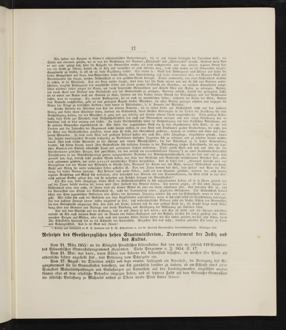Vom 21. März 1855: an die Königlich Preußiſchen Lehranſtalten ſind von nun an jaͤhrlich 149 Eremplare des Eiſenachiſchen Gymnaſialprogrammes abzuſenden. Siehe Programm v. J. 1854. S. 17.