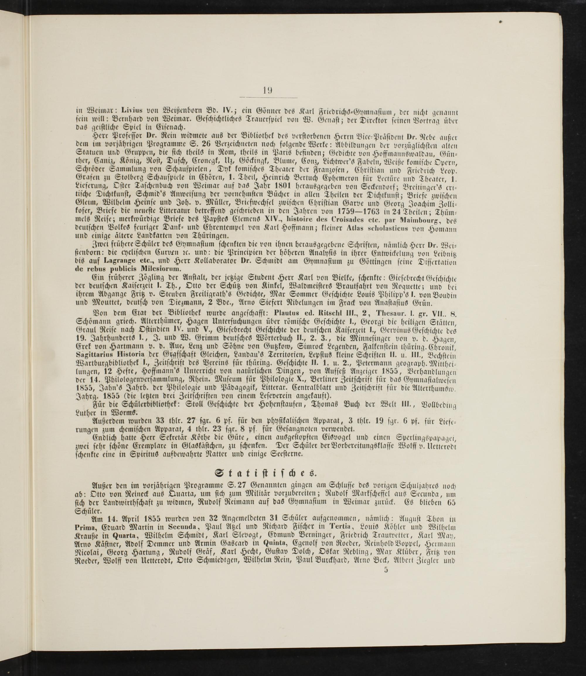 Von dem Etat der Bibliothek wurde angeſchafft: Plautus ed. Ritschl III., 2, Thesaur. J. gr. VII.. 8. Schömann griech. Alterthümer, Hagen Unterſuchungen über römiſche Geſchichte J., Georgi die heiligen Stätten Graul Reiſe nach Oſtindien IV. und V., Gieſebrecht Geſchichte der deutſchen Kaiſerzeit I., Gervinus Geſchichte des 19. Jahrhunderts I., J. und W. Grimm deutſches Wörterbuch II., 2. 3., die Minneſinger von v. d. Hagen, Erek von Hartmann v. d. Aue, Lenz und Söhne von Gutzkow, Simrock Legenden, Falkenſtein thüring. Chronik, Sagittarius Historia der Grgfſchaft Gleichen, Landau's Territorien, Lepſius kleine Schriften II. u. III., Bechſtein Wartburgbibliothek I., Zeitſchrift des Vereins für thüring. Geſchichte II. 1. u. 2., Petermann geograph. Mitthei lungen, 12 Hefte, Hoffmann's Unterricht von natürlichen Dingen, von Aufſeß Anzeiger 1855, Verhandlungen der 14. Philologenverſammlung, Rhein. Muſeum für Philologie X., Berliner Zeitſchrift für das Gymnaſialweſen 1855, Jahn's Jahrb. der Philologie und Pädagogik, Litterar. Centralblatt und Zeitſchrift für die Alterthumsw Jahrg. 1855(die letzten drei Zeitſchriften von einem Leſeverein angekauft).