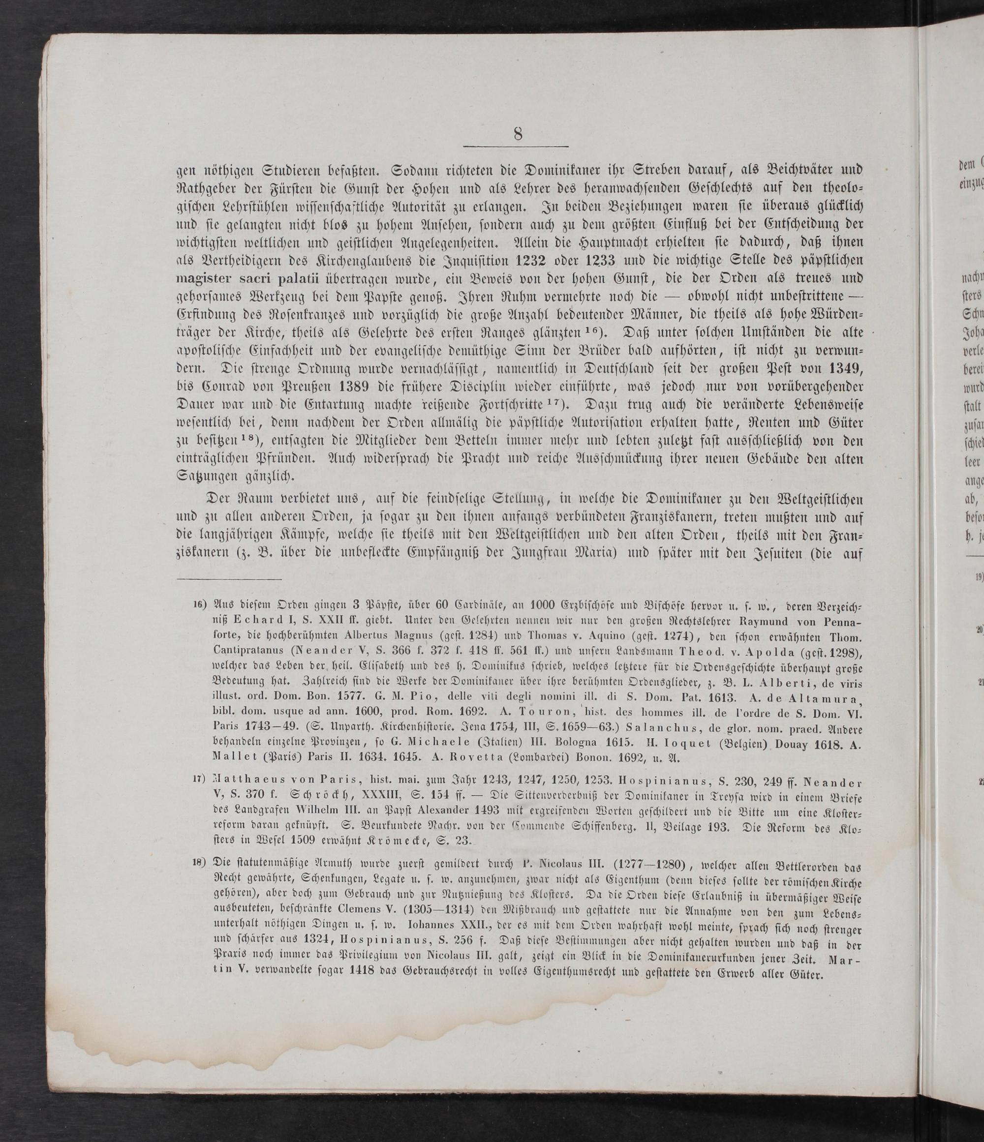 apoſtoliſche Einfachheit und der evangeliſche demüthige Sinn der Brüder bald aufhörten, iſt nicht zu verwun⸗ dern. Die ſtrenge Ordnung wurde vernachläſſigt, namentlich in Deutſchland ſeit der großen Peſt von 1349, bis Conrad von Preußen 1389 die frühere Disciplin wieder einführte, was jedoch nur von vorübergehender Dauer war und die Entartung machte reißende Fortſchritte 17). Dazu trug auch die veränderte Lebensweiſe weſentlich bei, denn nachdem der Orden allmälig die päpſtliche Autoriſation erhalten hatte, Renten und Güter zu beſitzen 18), entſagten die Mitglieder dem Betteln immer mehr und lebten zuletzt faſt ausſchließlich von den einträglichen Pfründen. Auch widerſprach die Pracht und reiche Ausſchmückung ihrer neuen Gebäude den alten Satzungen gänzlich.