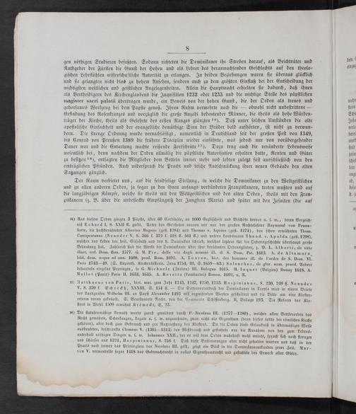16) Aus dieſem Orden gingen 3 Päpſte, über 60 Cardinäle, an 1000 Erzbiſchöſe und Biſchöfe hervor u. ſ. w., deren Verzeich⸗ niß Echard JI, S. XXII ff. giebt. Unter den Gelehrten nennen wir nur den großen Rechtslehrer Raymund von Penna- forte, die hochberühmten Albertus Magnus(geſt. 1284) und Thomas v. Aquino(geſt. 1274), den ſchon erwähnten Thom. Cantipratanus(Neander V, S. 366 f. 372 f. 418 ff. 561 ff.) und unſern Landsmann Theod. v. Apolda(geſt. 1298), welcher das Leben der heil. Eliſabeth und des h. Dominikus ſchrieb, welches letztere für die Ordensgeſchichte überhaupt große Bedeutung hat. Zahlreich ſind die Werke der Dominikaner über ihre berühmten Ordensglieder, z. B. L. Alberti, de viris illust. ord. Dom. Bon. 1577. G. M. Pio, delle viti degli nomini ill. di S. Dom. Pat. 1613. A. de Altamura bibl. dom. usque ad ann. 1600, prod. Rom. 1692. A. Touron, hist. des hommes ill. de l'ordre de S. Dom. VI. Paris 1743— 49.(S. Unparth. Kirchenhiſtorie. Jena 1754, III, S. 1659— 63.) Salanchus, de glor, nom. praed. Andere behandeln einzelne Provinzen, ſo G. Michaele(Italien) III. Bologna 1615. H. Ioquet(Belgien) Douay 1618. A. Mallet(Paris) Paris II. 1634. 1645. A. Rovetta(Lombardei) Bonon. 1692, u. A.