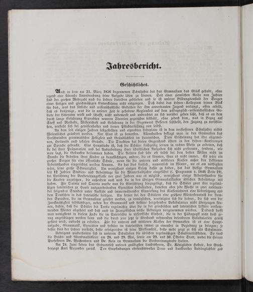 Auch in dem am 31. März 1856 begonnenen Schuljahre hat das Gymnaſium das Glück gehabt, ohne irgend eine ſtörende Unterbrechung ſeine Aufgabe löſen zu können. Seit einer ziemlichen Reihe von Jahren ſind der großen Mehrzahl nach die Lehrer dieſelben geblieben und ſo iſt unſerer Bildungsanſtalt der Seegen einer ſtetigen und gleichmäßigen Entwickelung nicht entgangen. Daß dabei das Lehrer⸗Kollegium ſeinen Blick für das, was das ſittliche und wiſſenſchaftliche Gedeihen der ihm anvertrauten Jugend verlangt, offen erhält, daß es dasjenige, was die in unſerer Zeit ſo gehobene Regſamkeit auf dem pädagogiſch⸗wiſſenſchaftlichen Ge⸗ biete der Litteratur wirkt und ſchafft, nicht unbemerkt und unbeachtet an ſich vorüber gehen läßt, daß es an dem durch lange Erfahrung Erprobten neueren Theorien gegenüber feſthält, ohne jedoch dem, was in Bezug auf Stoff und Methode, Wiſſenſchaft und Erfahrung in der Gegenwart Beſſeres feſtſtellt, den Zugang zu verſchlie⸗ ßen, verſteht ſich bei gewiſſenhafter und treuer Pflichterfüllung von ſelbſt. 1