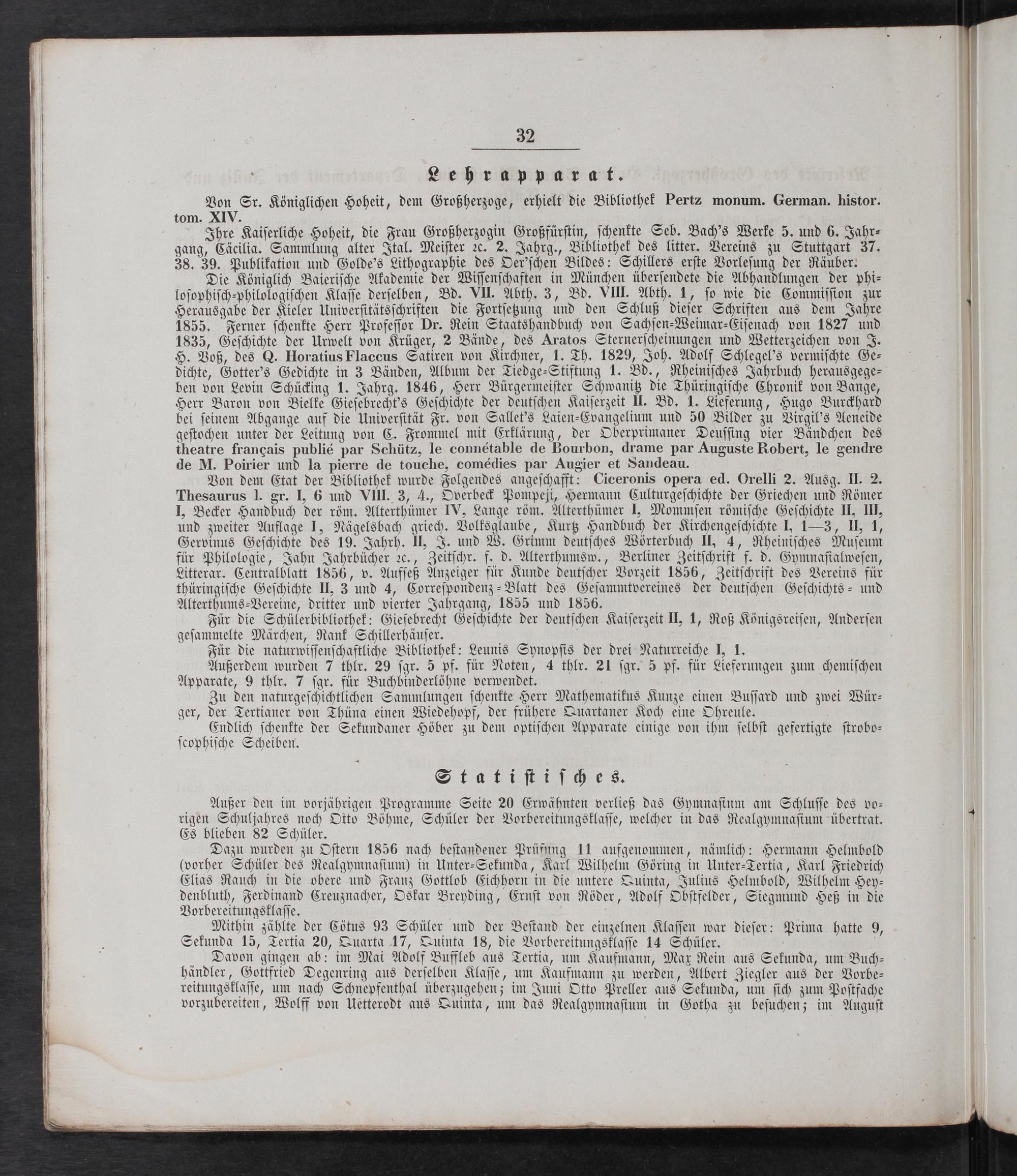 Von dem Etat der Bibliothek wurde Folgendes angeſchafft: Ciceronis opera ed. Orelli 2. Ausg. II. 2. Thesaurus l. gr. I, 6 und VIII. 3, 4., Overbeck Pompeji, Hermann Culturgeſchichte der Griechen und Römer I, Becker Handbuch der röm. Alterthümer IV. Lange röm. Alterthümer I, Mommſen römiſche Geſchichte II. III, und zweiter Auflage I, Nägelsbach griech. Volksglaube, Kurtz Handbuch der Kirchengeſchichte I. 1—3, II, 1, Gervinus Geſchichte des 19. Jahrh. II, J. und W. Grimm deutſches Wörterbuch II, 4, Rheiniſches Muſeum für Philologie, Jahn Jahrbücher ꝛc., Zeitſchr. f. d. Alterthumsw., Berliner Zeitſchrift f. d. Gymnaſialweſen, Litterar. Centralblatt 1856, v. Aufſeß Anzeiger für Kunde deutſcher Vorzeit 1856, Zeitſchrift des Vereins für thüringiſche Geſchichte II, 3 und 4, Correſpondenz⸗Blatt des Geſammtvereines der deutſchen Geſchichts⸗ und Alterthums-Vereine, dritter und vierter Jahrgang, 1855 und 1856.