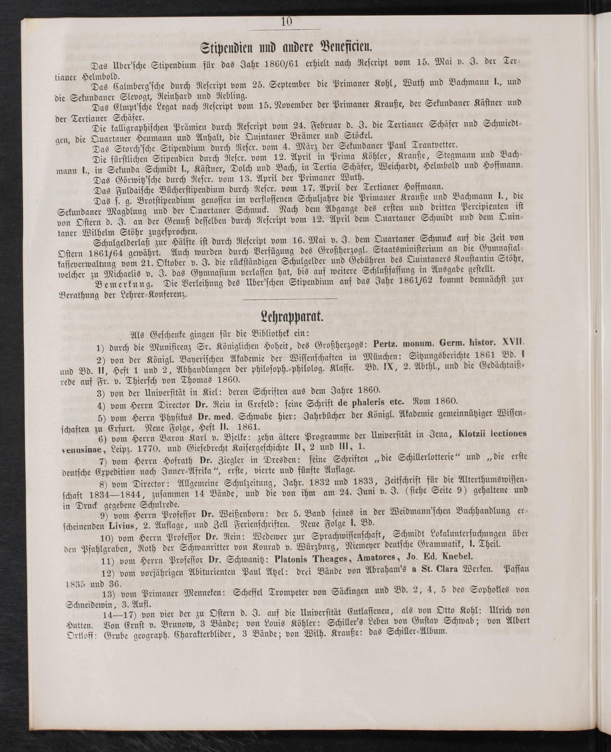 Die fürſtlichen Stipendien durch Reſcr. vom 12. April in Prima Köhler, Krauße, Stegmann und Bach— mann l., in Sekunda Schmidt l., Käſtner, Dolch und Bach, in Tertia Schäfer, Weichardt, Helmbold und Hoffmann.