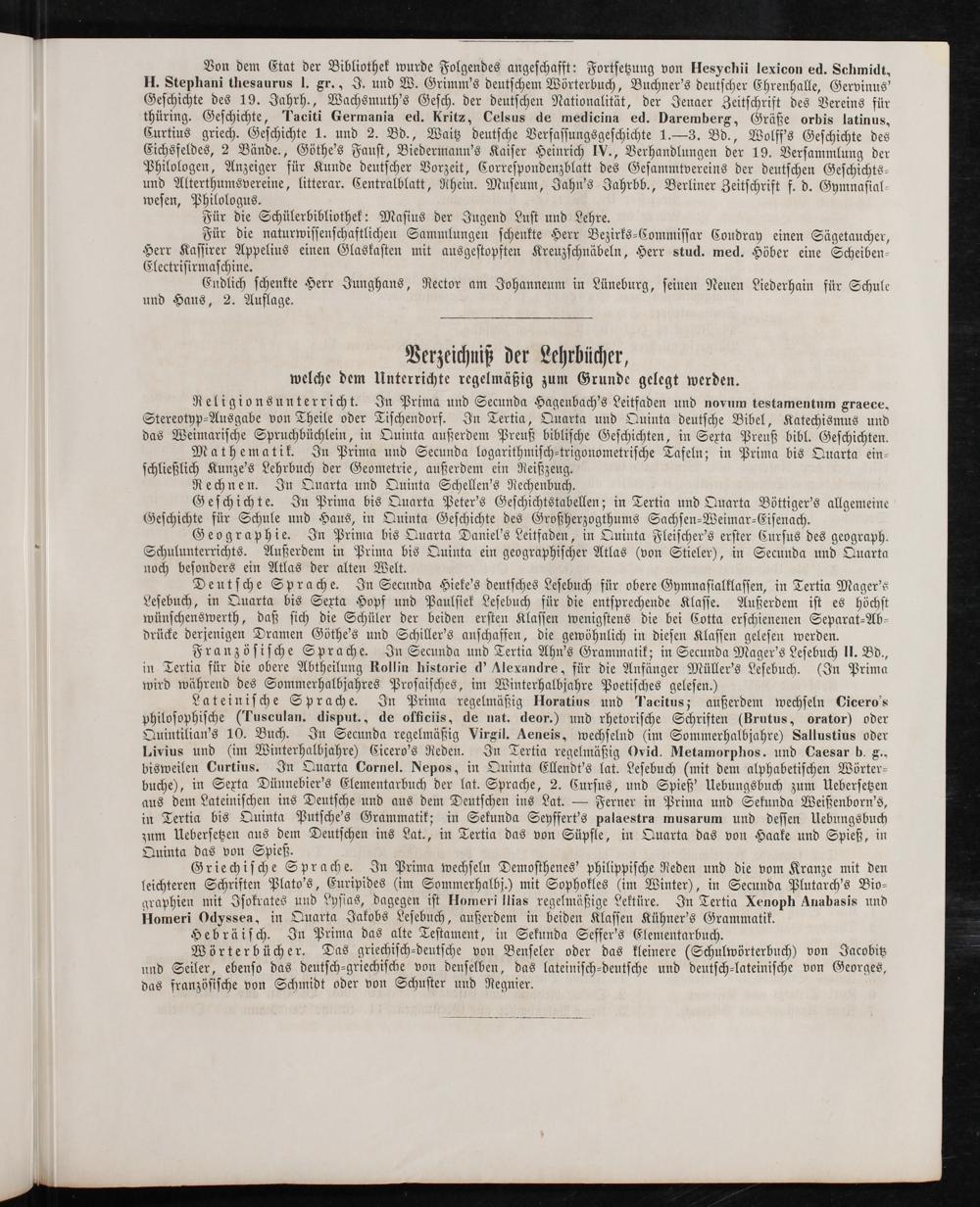 Von dem Etat der Bibliothek wurde Folgendes angeſchafft: Fortſetzung von Hesychii lexicon ed. Schmidt, H. Stephani thesaurus l. gr., J. und W. Grimm's deutſchem Wörterbuch, Buchner's deutſcher Ehrenhalle, Gervinus' Geſchichte des 19. Jahrh., Wachsmuth's Geſch. der deutſchen Nationalität, der Jenaer Zeitſchrift des Vereins für thüring. Geſchichte, Taciti Germania ed. Kritz, Celsus de medicina ed. Daremberg, Gräße orbis latinus, Curtius griech. Geſchichte 1. und 2. Bd., Wattz deutſche Verfaſſungsgeſchichte 1.— 3. Bd., Wolff's Geſchichte des Eichsfeldes, 2 Bände., Göthe's Fauſt, Biedermann's Kaiſer Heinrich IV., Verhandlungen der 19. Verſammlung der Philologen, Anzeiger für Kunde deutſcher Vorzeit, Correſpondenzblatt des Geſammtvereins der deutſchen Geſchichts⸗ und Alterthumsvereine, litterar. Centralblatt, Rhein. Muſeum, Jahn's Jahrbb., Berliner Zeitſchrift f. d. Gymnaſial— weſen, Philologus.