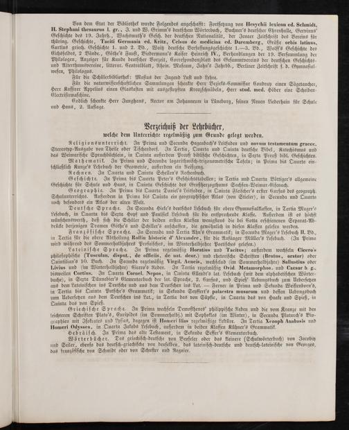Lateiniſche Sprache. In Prima regelmäßig Horatius und Tacitus; außerdem wechſeln Cicero's philoſophiſche(Tusculan. disput., de officiis, de nat. deor.) und rhetoriſche Schriften(Brutus, orator) oder Quintilian's 10. Buch. In Secunda regelmäßig Virgil. Aeneis, wechſelnd(im Sommerhalbjahre) Sallustius oder Livius und(im Winterhalbjahre) Cicero's Reden. In Tertia regelmäßig Ovid. Metamorphos. und Caesar b. g., bisweilen Curtius. In Quarta Cornel. Nepos, in Quinta Ellendt's lat. Leſebuch(mit dem alphabetiſchen Wörter⸗ buche), in Sexta Dünnebier's Elementarbuch der lat. Sprache, 2. Curſus, und Spieß' Uebungsbuch zum Ueberſetzen aus dem Lateiniſchen ins Deutſche und aus dem Deutſchen ins Lat.— Ferner in Prima und Sekunda Weißenborn's, in Tertia bis Quinta Putſche's Grammatik; in Sekunda Seyffert's palaestra musarum und deſſen Uebungsbuch zum Ueberſetzen aus dem Deutſchen ins Lat., in Tertia das von Süpfle, in Quarta das von Haake und Spieß, in Quinta das von Spieß.