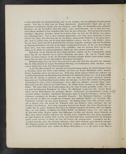 Doch nicht von der Zukunft will ich zu Euch sprechen, sondern von der Vergangenheit, warum dieser Tag für uns Deutsche von so grosser Bedeutung sein müsse. Ihr seid im Vérlaufe dieser Woche von Euren Lehrern in den für Geschichte bestimmten Stunden darüber schon belehrt worden; darum kann ich mich auf eine übersichtliche Darstellung beschränken.