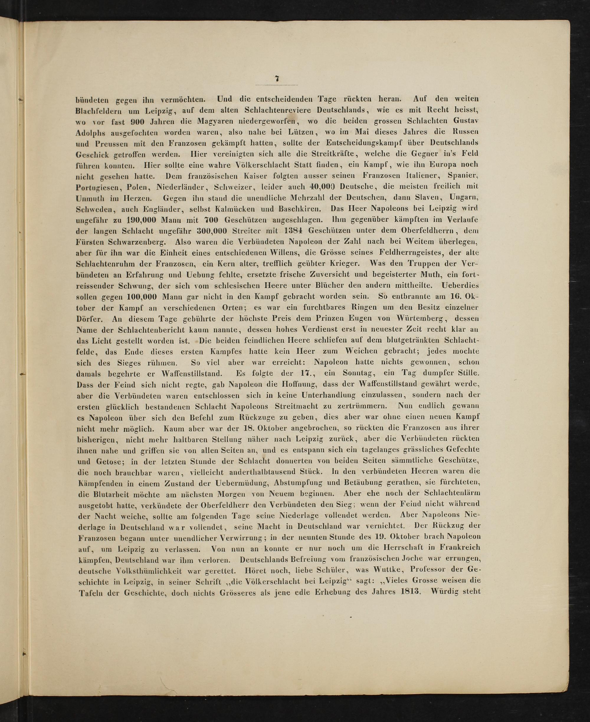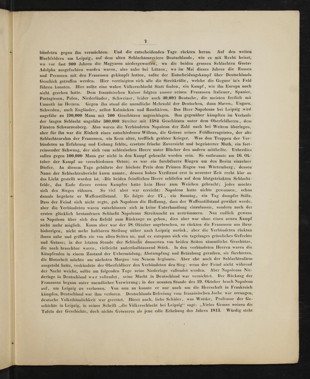 deutsche Volksthümlichkeit war gerettet. Höret noch, liebe Schüler, was Wuttke, Professor der Ge- schichte in Leipzig, in seiner Schrift„die Völkerschlacht bei Leipzig“ sagt:„Vieles Grosse weisen die Tafeln der Geschichte, doch nichts Grösseres als jene edle Erhebung des Jahres 1813. Würdig steht