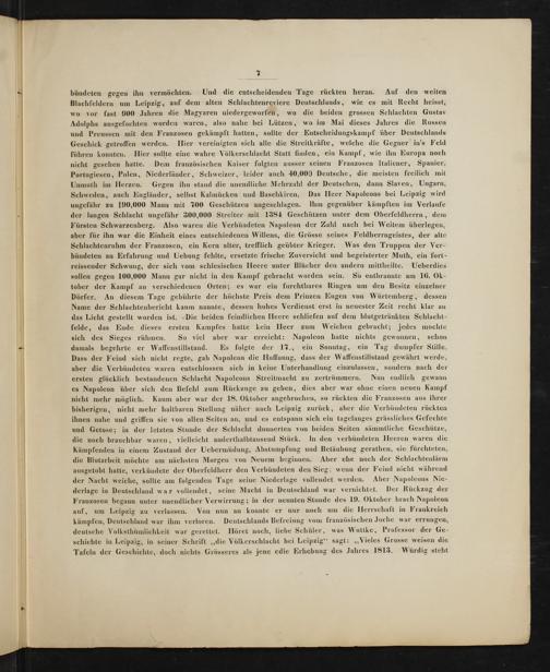 bündeten gegen ihn vermöchten. Und die entscheidenden Tage rückten heran. Auf den weiten Blachfeldern um Leipzig, auf dem alten Schlachtenreviere Deutschlands, wie es mit Recht heisst, wo vor fast 900 Jahren die Magyaren niedergeworfen, wo die beiden grossen Schlachten Gustav Adolphs ausgefochten worden waren, also nahe bei Lützen, wo im Mai dieses Jahres die Russen und Preussen mit den Franzosen gekämpft hatten, sollte der Entscheidungskampf über Deutschlands Geschick getroffen werden. Iier vereinigten sich alle die Streitkräfte, welche die Gegner in's Feld führen konnten. Hier sollte eine wahre Völkerschlacht Statt finden, ein Kampf, wie ihn Europa noch nicht gesehen hatte. Dem französischen Kaiser folgten ausser seinen Franzosen Italiener, Spanier, Portugiesen, Polen, Niederländer, Schweizer, leider auch 40,000 Deutsche, die meisten freilich mit Unmuth im Herzen. Gegen ihn stand die unendliche Mehrzahl der Deutschen, dann Slaven, Ungarn, Schweden, auch Engländer, selbst Kalmücken und Baschkiren. Das Heer Napoleons bei Leipzig wird ungefähr zu 190,000 Mann mit 700 Geschützen angeschlagen. Ihm gegenüber kämpften im Verlaufe der langen Schlacht ungefähr 300,000 Streiter mit 1384 Geschützen unter dem Oberfeldherrn, dem Fürsten Schwarzenberg. Also waren die Verbündeten Napoleon der Zahl nach bei Weitem überlegen, aber für ihn war die Einheit eines entschiedenen Willens, die Grösse seines Feldherrngeistes, der alte Schlachtenruhm der Franzosen, ein Kern alter, trefflich geübter Krieger. Was den Truppen der Ver- bündeten an Erfahrung und Uebung fehlte, ersetzte frische Zuversicht und begeisterter Muth, ein fort- reissender Schwung, der sich vom schlesischen Heere unter Blücher den andern mittheilte. Ueberdies sollen gegen 100,000 Mann gar nicht in den Kampf gebracht worden sein. So entbrannte am 16. Ok- tober der Kampf an verschiedenen Orten; es war ein furchtbares Ringen um den Besitz einzelner Dörfer. An diesem Tage gebührte der höchste Preis dem Prinzen Eugen von Würtemberg, dessen Name der Schlachtenbericht kaum nannte, dessen hohes Verdienst erst in neuester Zeit recht klar an das Licht gestellt worden ist. Die beiden feindlichen Heere schliefen auf dem blutgetränkten Schlacht- felde, das Ende dieses ersten Kampfes hatte kein Heer zum Weichen gebracht; jedes mochte sich des Sieges rühmen. So viel aber war erreicht: Napoleon hatte nichts gewonnen, schon damals begehrte er Waffenstillstand. Es folgte der 17., ein Sonntag, ein Tag dumpfer Stille. Dass der Feind sich nicht regte, gab Napoleon die Hoffnung, dass der Waffenstillstand gewährt werde, aber die Verbündeten waren entschlossen sich in keine Unterhandlung einzulassen, sondern nach der ersten glücklich bestandenen Schlacht Napoleons Streitmacht zu zertrümmern. Nun endlich gewann es Napoleon über sich den Befehl zum Rückzuge zu geben, dies aber war ohne einen neuen Kampf nicht mehr möglich. Kaum aber war der 18. Oktober angebrochen, so rückten die Franzosen aus ihrer bisherigen, nicht mehr haltbaren Stellung näher nach Leipzig zurück, aber die Verbündeten rückten ihnen nahe und griffen sie von allen Seiten an, und es entspann sich ein tagelanges grässliches Gefechte und Getose; in der letzten Stunde der Schlacht donuerten von beiden Seiten sämmtliche Geschütze, die noch brauchbar waren, vielleicht anderthalbtausend Stück. In den verbündeten Heeren waren die Kämpfenden in einem Zustand der Uebermüdung, Abstumpfung und Betäubung gerathen, sie fürchteten, die Blutarbeit möchte am nächsten Morgen von Neuem beginnen. Aber ehe noch der Schlachtenlärm ausgetobt hatte, verkündete der Oberfeldherr den Verbündeten den Sieg; wenn der Feind nicht während der Nacht weiche, sollte am folgenden Tage seine Niederlage vollendet werden. Aber Napoleons Nie- derlage in Deutschland war vollendet, seine Macht in Deutschland war vernichtet. Der Rückzug der Franzosen begann unter unendlicher Verwirrung; in der neunten Stunde des 19. Oktober brach Napoleon auf, um Leipzig zu verlassen. Von nun an konnte er nur noch um die Herrschaft in Frankreich kämpfen, Deutschland war ihm verloren. Deutschlands Befreiung vom französischen Joche war errungen,