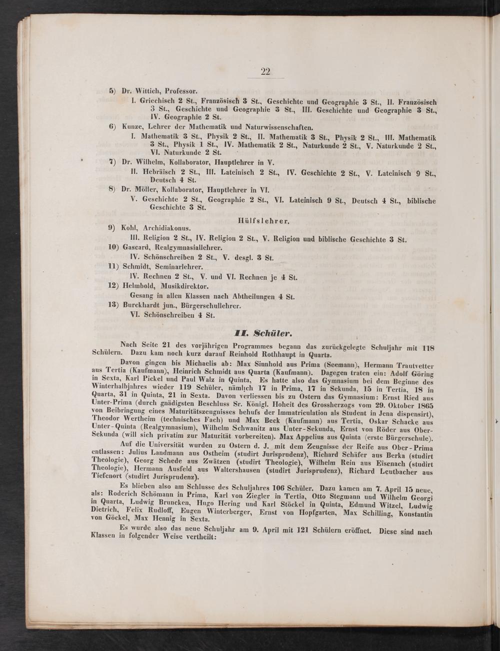 Davon gingen bis Michaelis ab: Max Sinnhold aus Prima(Seemann), Hermann Trautvetter aus Tertia(Kaufmann), Heinrich Schmidt aus Quarta(Kaufmann). Dagegen traten ein: Adolf Göring in Sexta, Karl Pickel und Paul Walz in Quinta, Es hatte also das Gymnasium bei dem Beginne des Winterhalbjahres wieder 119 Schüler, nämlich 17 in Prima, 17 in Sekunda, 15 in Tertia, 18 in Quarta, 31 in Quinta, 21 in Sexta. Davon verliessen bis zu Ostern das Gymnasium: Ernst Ried aus Unter-Prima(durch gnädigsten Beschluss Sr. Königl. Hoheit des Grossherzogs vom 29. Oktober 1865 von Beibringung eines Maturitätszeugnisses behufs der Immatriculation als Student in Jena dispensirt), Theodor Wertheim(technisches Fach) und Max Beck(Kaufmann) aus Tertia, Oskar Schacke aus Unter-Quinta(Realgymnasium), Wilhelm Schwanitz aus Unter-Sekunda, Ernst von Röder aus Ober- Sekunda(will sich privatim zur Maturität vorbereiten). Max Appelius aus Quinta(erste Bürgerschule).