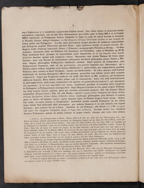 2) E. Zellerum, qui magnam fragmentorum Philolai partem ſide dignam judicaverat(Philosoph. der Gr., vol. I, p. 211. 241) et maxime A. Böckhium, qui omnia, quae Philolai nomen habent, fragmenta genuina censuerat(Philolaos des Pythago- reers Leben von A. Böckh.), C. Schaarschmidtius sane non levibus impugnavit argumentis.(Die angebliche Schriftstellerei des Philolaos und die Bruchstücke der ihm zugeschriebenen Bücher, Bonn 1864.)