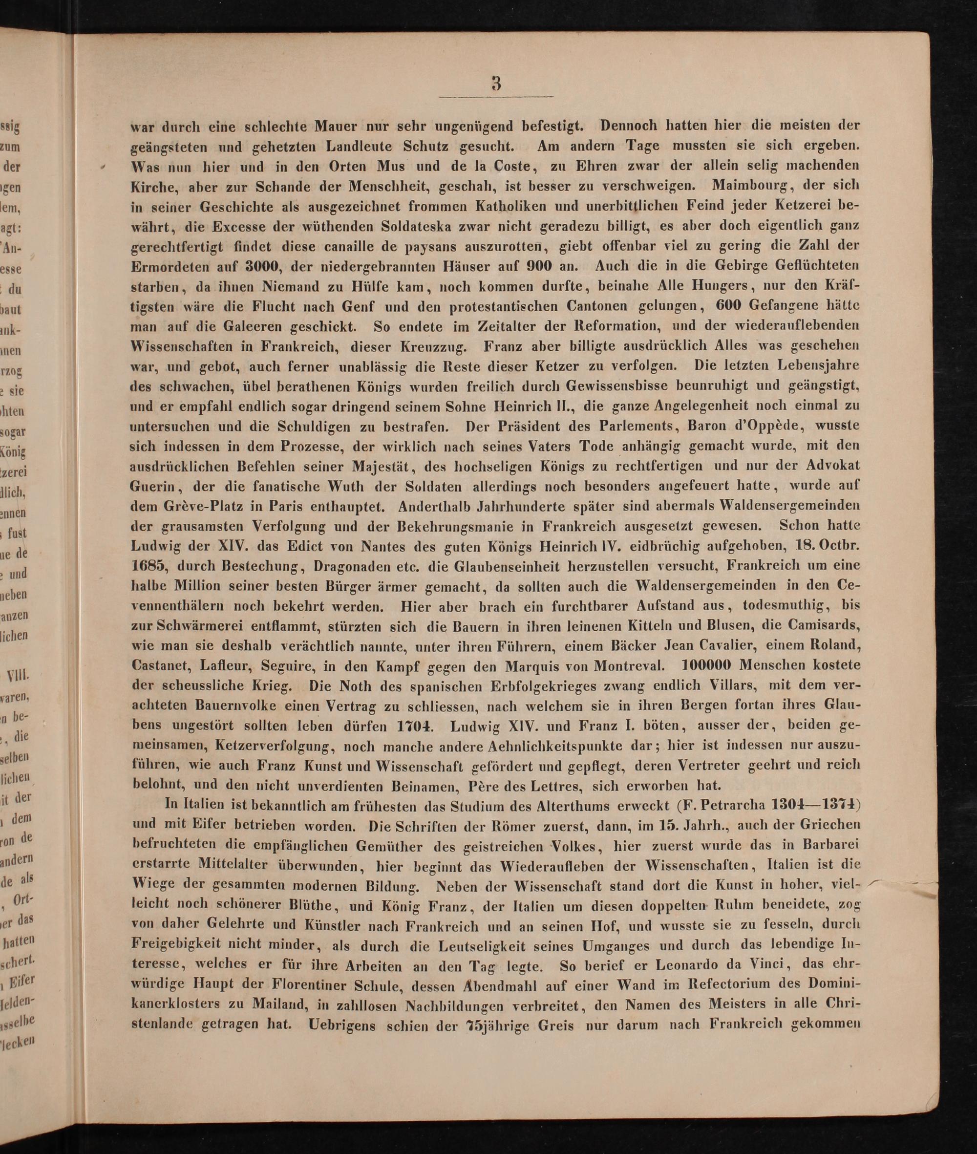 war durch eine schlechte Mauer nur sehr ungenügend befestigt. Dennoch hatten hier die meisten der geängsteten und gehetzten Landleute Schutz gesucht. Am andern Tage mussten sie sich ergeben. Was nun hier und in den Orten Mus und de la Coste, zu Ehren zwar der allein selig machenden Kirche, aber zur Schande der Menschheit, geschah, ist besser zu verschweigen. Maimbourg, der sich in seiner Geschichte als ausgezeichnet frommen Katholiken und unerbittlichen Feind jeder Ketzerei be- währt, die Excesse der wüthenden Soldateska zwar nicht geradezu billigt, es aber doch eigentlich ganz gerechtfertigt findet diese canaille de paysans auszurotten, giebt offenbar viel zu gering die Zahl der Ermordeten auf 3000, der niedergebrannten Hänser auf 900 an. Auch die in die Gebirge Geflüchteten starben, da ihnen Niemand zu Hülfe kam, noch kommen durfte, beinahe Alle Hungers, nur den Kräf- tigsten wäre die Flucht nach Genf und den protestantischen Cantonen gelungen, 600 Gefangene hätte man auf die Galeeren geschickt. So endete im Zeitalter der Reformation, und der wiederauflebenden Wissenschaften in Frankreich, dieser Kreuzzug. Franz aber billigte ausdrücklich Alles was geschehen war, und gebot, auch ferner unablässig die Reste dieser Ketzer zu verfolgen. Die letzten Lebensjahre des schwachen, übel berathenen Königs wurden freilich durch Gewissensbisse beunruhigt und geängstigt, und er empfahl endlich sogar dringend seinem Sohne Heinrich II., die ganze Angelegenheit noch einmal zu untersuchen und die Schuldigen zu bestrafen. Der Präsident des Parlements, Baron d'Oppède, wusste sich indessen in dem Prozesse, der wirklich nach seines Vaters Tode anhängig gemacht wurde, mit den ausdrücklichen Befehlen seiner Majestät, des hochseligen Königs zu rechtfertigen und nur der Advokat Guerin, der die fanatische Wuth der Soldaten allerdings noch besonders angefeuert hatte, wurde auf dem Grève-Platz in Paris enthauptet. Anderthalb Jahrhunderte später sind abermals Waldensergemeinden der grausamsten Verfolgung und der Bekehrungsmanie in Frankreich ausgesetzt gewesen. Schon hatte Ludwig der XIV. das Edict von Nantes des guten Königs Heinrich IV. eidbrüchig aufgehoben, 18. Octbr. 1685, durch Bestechung, Dragonaden etc. die Glaubenseinheit herzustellen versucht, Frankreich um eine halbe Million seiner besten Bürger ärmer gemacht, da sollten auch die Waldensergemeinden in den Ce- vennenthälern noch bekehrt werden. Hier aber brach ein furchtbarer Aufstand aus, todesmuthig, bis zur Schwärmerei entflammt, stürzten sich die Bauern in ihren leinenen Kitteln und Blusen, die Camisards, wie man sie deshalb verächtlich nannte, unter ihren Führern, einem Bäcker Jean Cavalier, einem Roland, Castanet, Lafleur, Seguire, in den Kampf gegen den Marquis von Montreval. 100000 Menschen kostete der scheussliche Krieg. Die Noth des spanischen Erbfolgekrieges zwang endlich Villars, mit dem ver- achteten Bauernvolke einen Vertrag zu schliessen, nach welchem sie in ihren Bergen fortan ihres Glau- bens ungestört sollten leben dürfen 1704. Ludwig XIV. und Franz I. böten, ausser der, beiden ge- meinsamen, Ketzerverfolgung, noch manche andere Aehnlichkeitspunkte dar; hier ist indessen nur auszu- führen, wie auch Franz Kunst und Wissenschaft gefördert und gepflegt, deren Vertreter geehrt und reich belohnt, und den nicht unverdienten Beinamen, Père des Lettres, sich erworben hat.