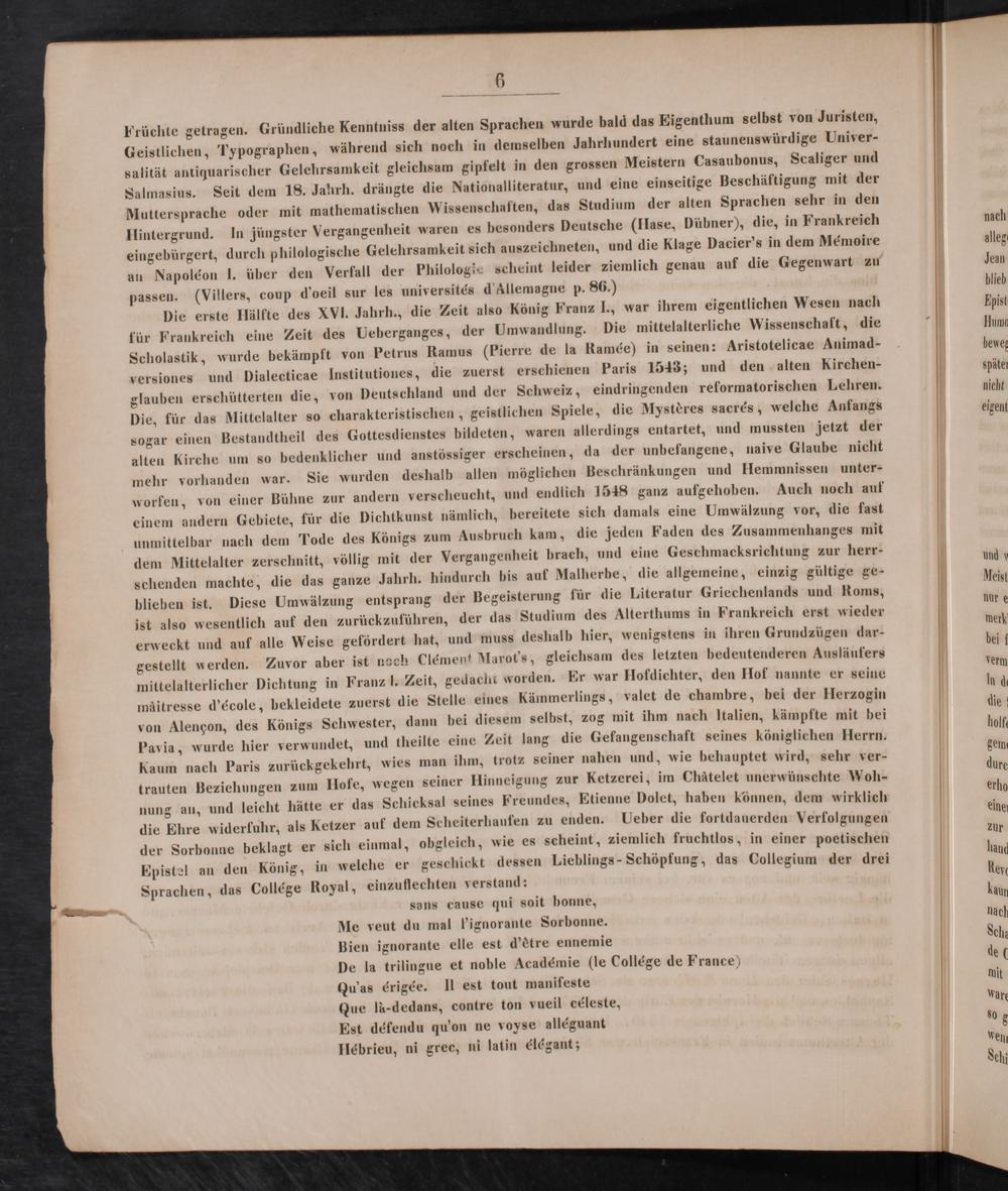 Früchte getragen. Gründliche Kenntniss der alten Sprachen wurde bald das Eigenthum selbst von Juristen, Geistlichen, Typographen, während sich noch in demselben Jahrhundert eine staunenswürdige Univer- salität antiquarischer Gelehrsamkeit gleichsam gipfelt in den grossen Meistern Casaubonus, Scaliger und Salmasius. Seit dem 18. Jahrh. drängte die Nationalliteratur, und eine einseitige Beschäftigung mit der Muttersprache oder mit mathematischen Wissenschaften, das Studium der alten Sprachen sehr in den IHlintergrund. In jüngster Vergangenheit waren es besonders Deutsche(IIase, Dübner), die, in Frankreich eingebürgert, durch philologische Gelehrsamkeit sich auszeichneten, und die Klage Dacier's in dem Mémoire an Napoléon I. über den Verfall der Philologie scheint leider ziemlich genau auf die Gegenwart zu passen.(Villers, coup d'oeil sur les universités d'Allemagne p. 86.)