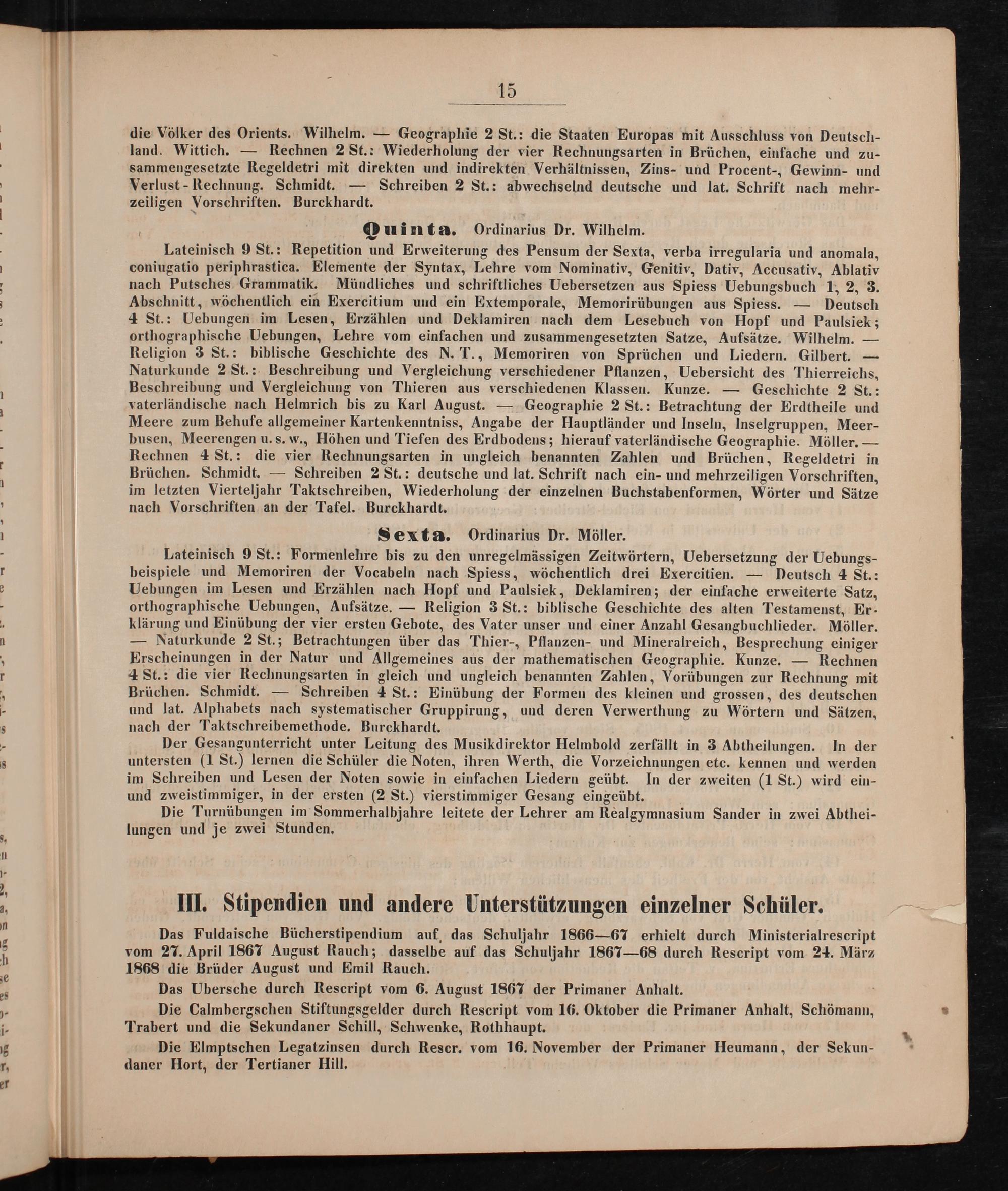 Das Fuldaische Bücherstipendium auf, das Schuljahr 1866—67 erhielt durch Ministerialrescript vom 27. April 1867 August Rauch; dasselbe auf das Schuljahr 1867—68 durch Rescript vom 24. Mär⸗z 1868 die Brüder August und Emil Rauch.
