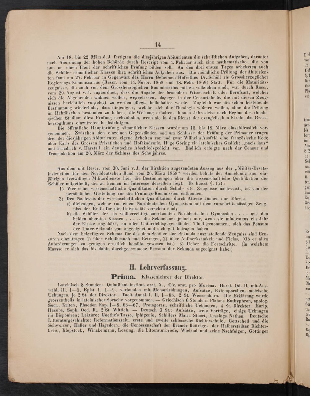 Regierungs-Kommissarius(Rescr. vom 14. Novbr. 1868 und 18. Febr. 1869) Statt. Für die Maturitäts- zeugnisse, die auch von dem Grossherzoglichen Kommissarius mit zu vollziehen sind, war durch Rescr. vom 29. August v. J. angeordnet, dass die Angabe der besondern Wissenschaft oder Berufsart, welcher sich die Abgehenden widmen wollen, weggelassen, dagegen in der Censurtabelle, die mit diesen Zeug- nissen berichtlich vorgelegt zu werden pflegt, beibehalten werde. Zugleich war die schon bestehende Bestimmung wiederholt, dass diejenigen, welche sich der Theologie widmen wollen, ohne die Prüfung im Hebräischen bestanden zu haben, die Weisung erhalten, binnen Jahresfrist nach Beginn des theolo- gischen Studium diese Prüfung nachzuholen, wenn sie in den Dienst der evangelischen Kirche das Gross- herzogthums einzutreten beabsichtigen.