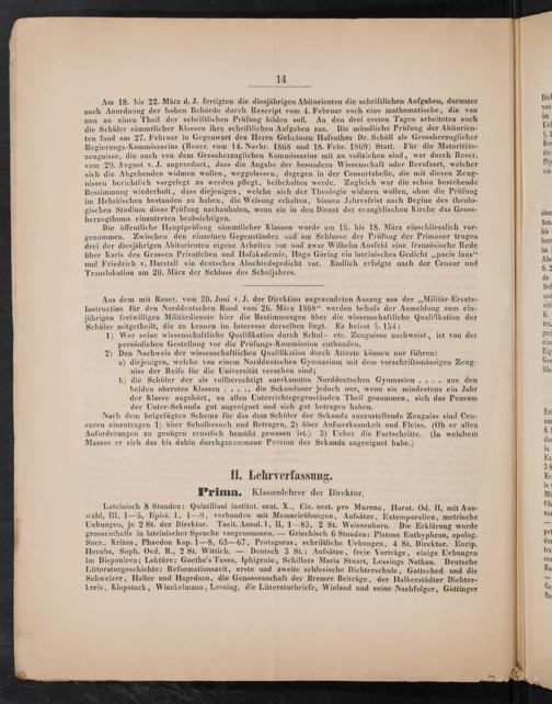 im Disponiren; Lektüre: Goethe's Tasso, Iphigenie, Schillers Maria Stuart, Lessings Nathan. Deutsche Litteraturgeschichte: Reformationszeit, erste und zweite schlesische Dichterschule, Gottsched und die Schweizer, Haller und Hagedorn, die Genossenschaft der Bremer Beiträge, der Halberstädter Dichter- kreis, Klopstock, Winckelmann, Lessing, die Litteraturbriefe, Wieland und seine Nachfolger, Göttinger