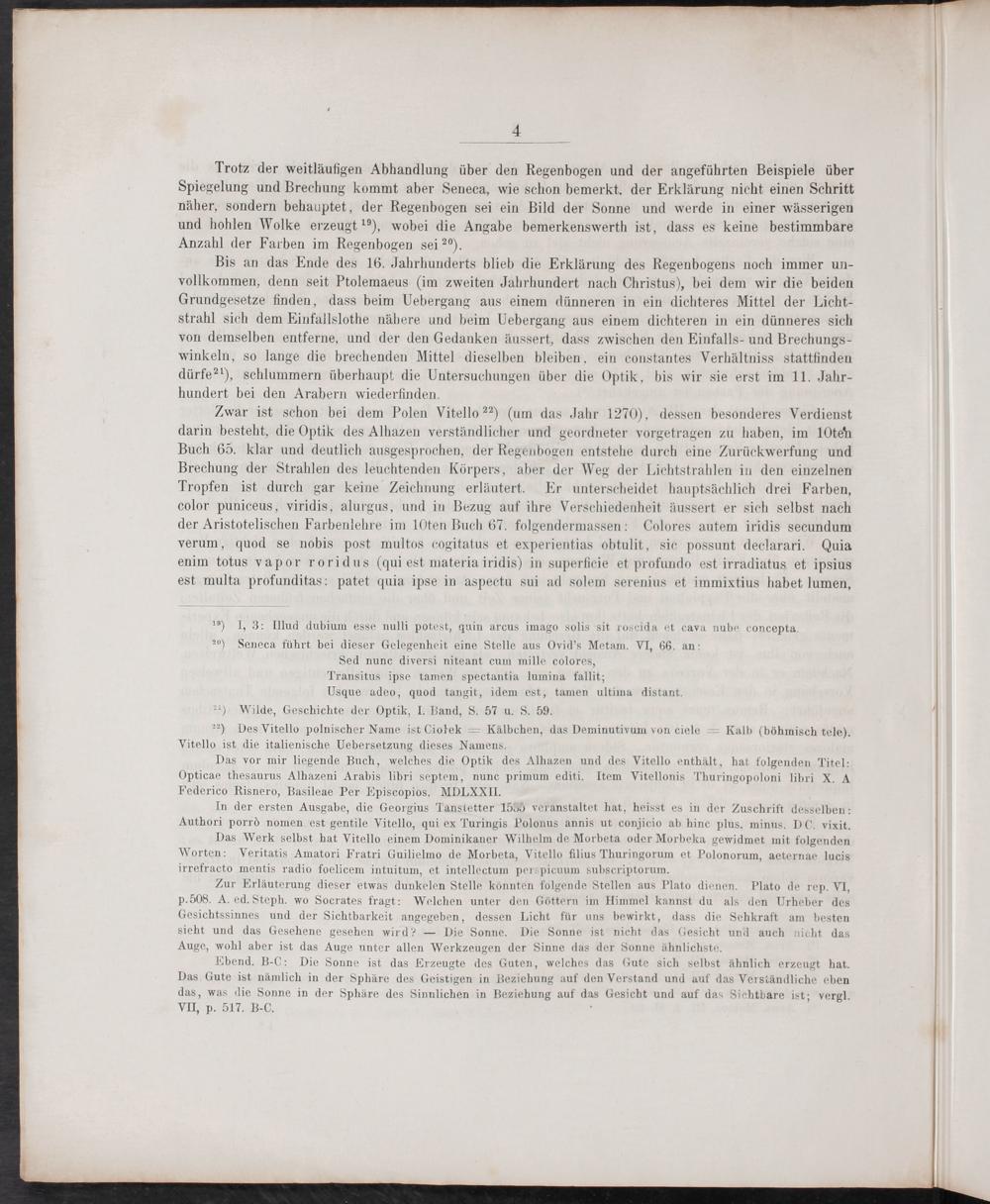 ¹⁵) I, 3: Illud dubium esse nulli potest, quin arcus imago solis sit roscida et cava nube concepta ²⁰) Seneca führt bei dieser Gelegenheit eine Stelle aus Ovid's Metam. VI, 66. an: Sed nunc diversi niteant cum mille colores, Transitus ipse tamen spectantia lumina fallit; Usque adeo, quod tangit, idem est, tamen ultima distant.