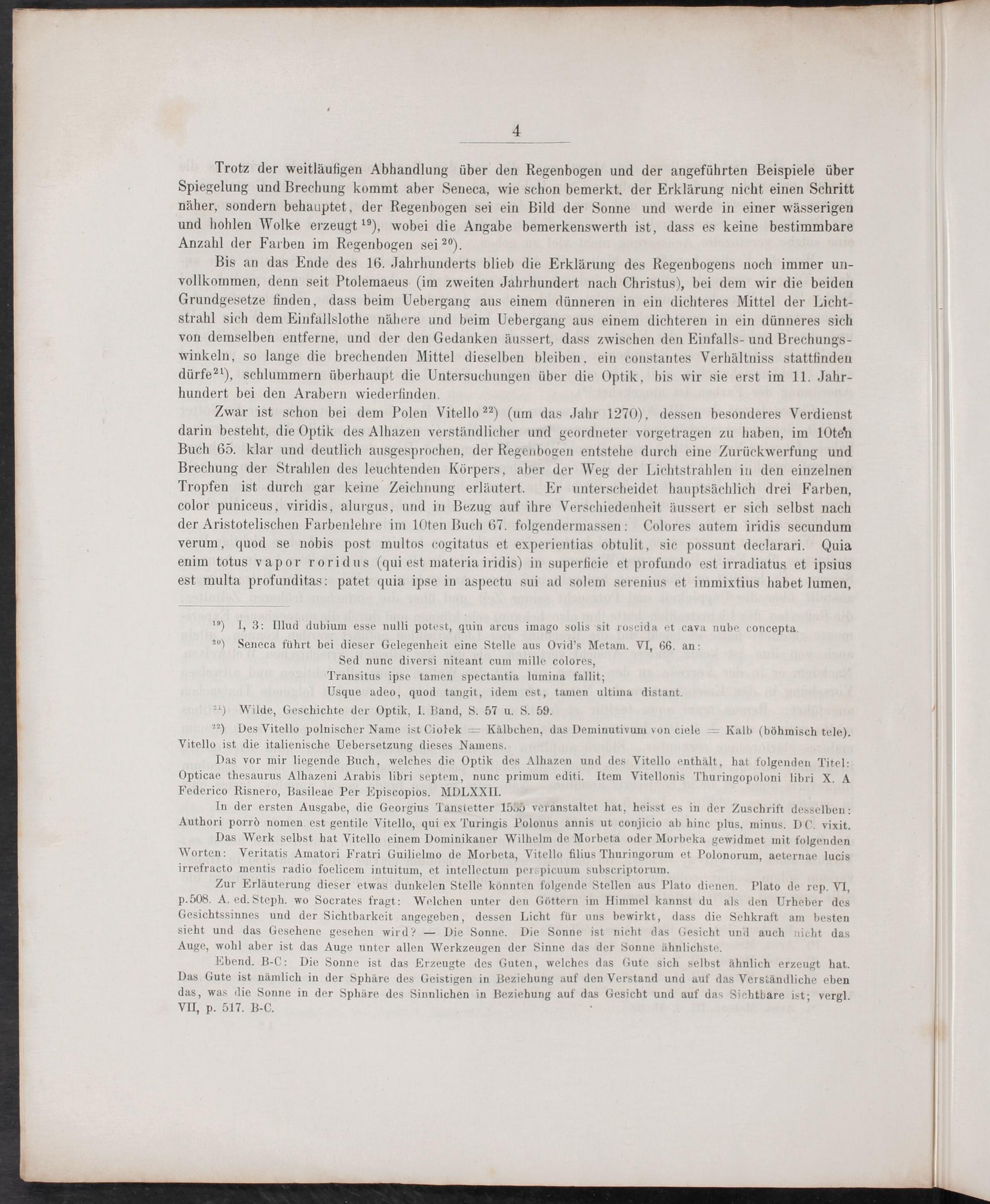 Zwar ist schon bei dem Polen Vitello ²²)(um das Jahr 1270), dessen besonderes Verdienst darin besteht, die Optik des Alhazen verständlicher und geordneter vorgetragen zu haben, im 10ten Buch 65. klar und deutlich ausgesprochen, der Regenbogen entstehe durch eine Zurückwerfung und Brechung der Strahlen des leuchtenden Körpers, aber der Weg der Lichtstrahlen in den einzelnen Tropfen ist durch gar keine Zeichnung erläutert. Er unterscheidet hauptsächlich drei Farben, color puniceus, viridis, alurgus, und in Bezug auf ihre Verschiedenheit äussert er sich selbst nach der Aristotelischen Farbenlehre im 10ten Buch 67. folgendermassen: Colores autem iridis secundum verum, quod se nobis post multos cogitatus et experientias obtulit, sic possunt declarari. Quia enim totus vapor roridus(qui est materia iridis) in superficie et profundo est irradiatus et ipsius est multa profunditas: patet quia ipse in aspectu sui ad solem serenius et immixtius habet lumen,
