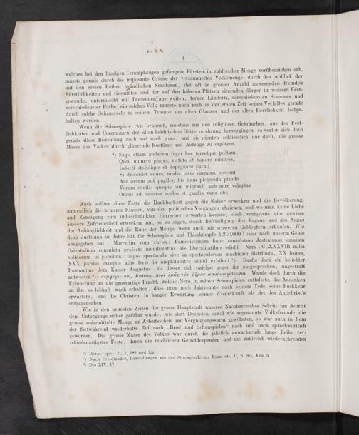 Wie in den neuesten Zeiten die grosse Hauptstadt unseres Nachbarreiches Schritt um Schritt dem Untergange näher geführt wurde, wie dort Despoten sowol wie sogenannte Volksfreunde die grosse unbemittelte Menge an Arbeitsscheu und Vergnügungssucht gewöhnten, so war auch in Rom der fortwährend wiederholte Ruf nach„Brod und Schauspielen“ nach und nach sprüchwörtlich geworden. Die grosse Masse des Volkes war durch die jährlich anwachsende lange Reihe ver- schiedenartigster Feste, durch die reichlichen Getreidespenden und die zahlreich wiederkehrenden