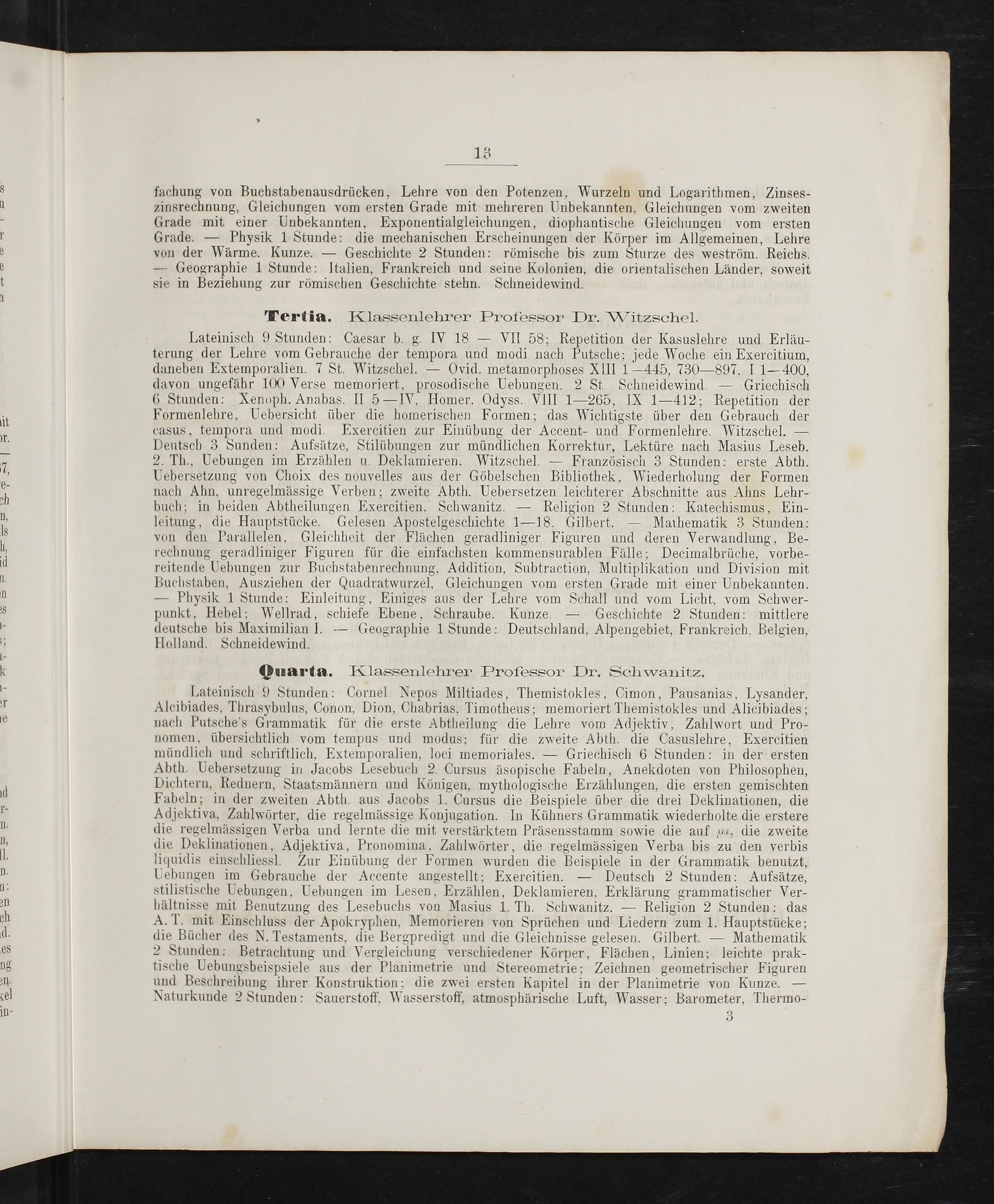 Grade.— Physik 1 Stunde: die mechanischen Erscheinungen der Körper im Allgemeinen, Lehre von der Wärme. Kunze.— Geschichte 2 Stunden: römische bis zum Sturze des weström. Reichs.
