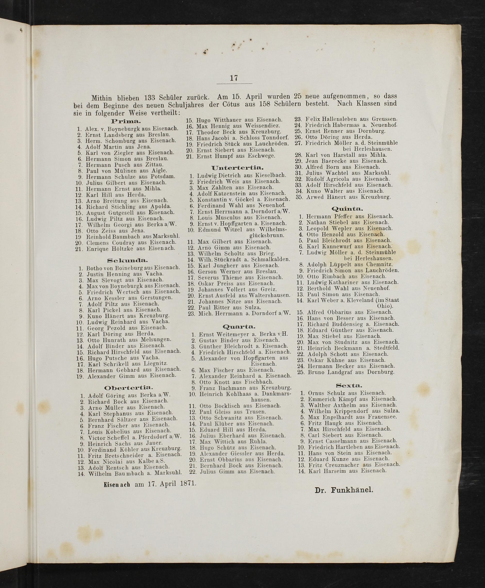 9. Kuno Hänert aus Kreuzburg. 23. Mich. Herrmann a. Dorndorf aW. 15. Alfred Obbarius aus Eisenach. Ludwig Reinhard aus Vacha. 16. Hans von Besser aus Eisenach. Georg Pezold aus Eisenach. Quarta. 17. Richard Buddensieg a. Eisenach.