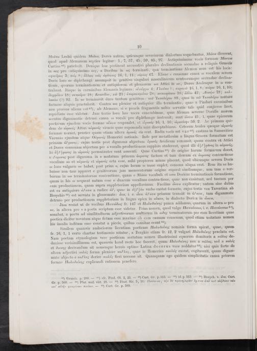 Moõ Lesbii quidem Moĩoα, Dores autem, quicunque severiorem dialectum sequebantur, Moοσα dicerent, quod apud Alcmanem septies legitur: 1, 7, 37, 45, 59, 85, 97. Antiquissimam vocis formam NMovriα Curtius ⁴⁰) patefecit. Denique huc pertinent accusativi plurales declinationis secundae a reliquis Graecis in oug pro untiquissimo ovc«, a Doribus in we terminati, qua terminatione Alcman usus est his locis: 0†ετm ³3; 2 8; 11οςα ς d⁵οσια 16, 1, 11; vGοσ 67. Flisae consonae causa vocalem severa Doris loco ow diphthongi assumpsit in genitivo singulari masculinorum neutrorumque secundae declina- tionis, quorum terminationem et antiquiorem et pleniorem Attici in ov, Dores Aeolesque in con- trahunt. Itaque in carminibus Alcmanis legimus: 2dmοꝓνυέ 4; I1ααό 8; Gτ⁵ασια 16, 1, 8; 00 16, 1, 10; *νοο s⁴⁵8; auοα⁵ςο 18; Kuowde, 1 21; dnερταισκινμ 28; 2uνια̈οοοω 38; 2,11% 42; Avnno 73; nHν Nanld(?) 92. In ov terminavit duos tantum genitivos: roꝰ Tnnoν⁶ινο 88, quos in 10 Tnrodνα mutare fortasse aliquis praetulerit. Contra ο plenior et antiquior illa terminatio, quae a Pindari carminibus non prorsus aliena est ⁴⁷), ab Alcmane, si e paucis fragmentis nobis servatis tale quid conjicere licet, repudiata esse videtur. Jam tertio loco has voces enarrabimus, quas Alcman severae Doridis morem secutus digammatis detrusi causa vocali pro diphthongo instruxit; sunt dora 41, 1, quae epicorum poetarum ejusdem vocis formae oναe respondet, et dοαν⁶ς 16, 1, 16; 6Hαeκέασέ 59, 2. Ac primum qui- dem de αν⁶ς Attici odοαeςςo vicario quae exponenda sunt disceptabimus. Ceterum Aeoles quoque 659 6οG formam norant, praeter quam etiam altera 60 ε⁶σ eis erat. Radix vocis est var ¹⁸) exstans in Sanscritico Varunas ejusdem atque Odοασο MHomerici notionis. Inde per metathesim a lingua Graeca formatum est primum 6 Oανοο, cujus testis post digamma abjectum dααeν⁴ς Aeolicum remansit, quum contra et Attici et Dores consonam abjectam per o vocalis productionem supplere studerent, quod illi à[◻loaævos in oναυκ⁶σ†, hi à aανοο in Gανο permutantes sunt assecuti. Quae Curtius ¹⁰) de origine harum formarum docet, e Fodvog post digamma in o mutatum primum 609urog factum et tum demum ex 6G G 8οοο contractione vocalium 0o et osαν⁶ς εt Gòοανς orta esse, mihi propterea minus placent, quod ubicunque severa Doris loco vulgaris ow habet, post prius o, cujus locum nunc explet, consona aliqua erat. Rem ita se ha- buisse non tam apparet e genitivorum jam memoratorum origine οrτοαmπ similiumque, non tam e ver- borum in o terminatorum contractione, quam e Nlooοα vocabuli et οωια Doricae terminationis formatione, quum in his nequeat natum esse e quarum vocalium contractione, quae non exsistunt, sed tantum per eam productionem, quam supra suppletoriam appellavimus. Facilius oza explicatur; natum sine dubio est ex antiquiore âfοra a radice df, quae in àl* verbo exstat formato, cujus testis vox Tarentina ab Hesychio ³⁰) est servata in glossemate: dra, i. e. Gra. äfara primum transiit in âαα, tum digammate detruso per productionem suppletoriam in lingua epica in obcra, in dialecto Dorica in rc.