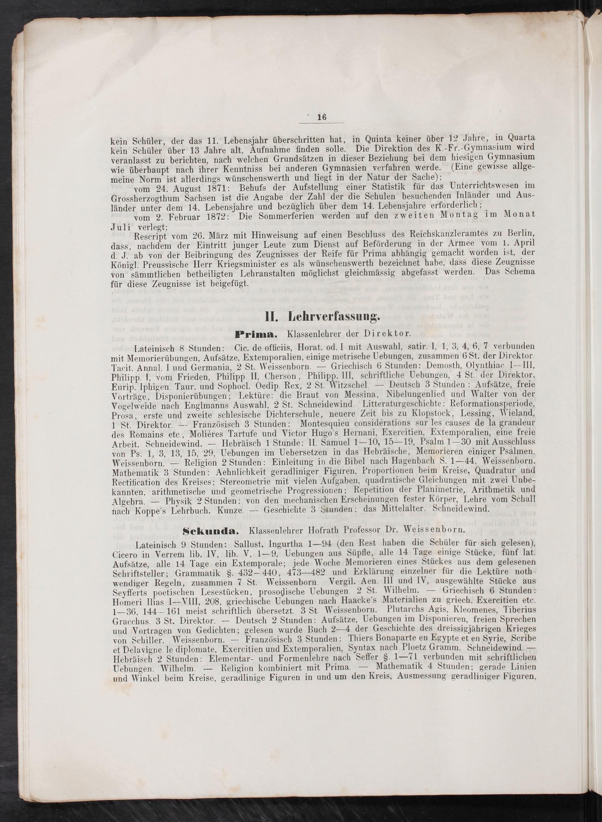 Sekunda. Klassenlehrer Hofrath Professor Dr. Weissenborn.