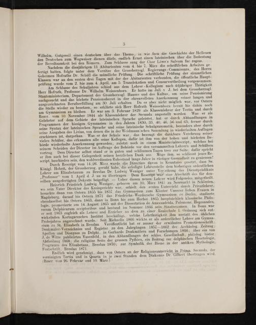 Wilhelm, Gutgesell einen deutschen über das Thema, in wie fern die Geschichte der Hellenen den Deutschen zum Wegweiser dienen dürfe. endlich Ernst einen lateinischen über die Bedeutung der Beredtsamkeit bei den Römern. Zum Schlusse sang der Chor Löwe'’s Salvum fac regem. Nachdem die diesjährigen 11 Abiturienten vom 4. pis 7. März die schriftlichen Arbeiten ge- fertigt hatten. folgte unter dem Vorsitze des Grossherzogl. Regierungs-Commissars, des Herrn Geheimen Hofraths Dr. Schöll die mündliche Prüfung. Die schriftliche Prüfung der sämmtlichen Kklassen war an den ersten drei Tagen mit der der Abiturienten verbunden, die öffentliche Haupt- prüfung wurde vom 2. his zum 4. April, am 5. Translokation und Censurvertheilung vorgenommien. Am Schlusse des Schuljahres schied aus dem Lehrer-Kollegium nach 44jähriger Thätigkeit Herr Hofrath, Professor Dr. Wilhelm Weissenborn. Er hatte im Juli v J. bei dem Grossherzogl. Staatsministerium, Departement des Grossherzogl. Hauses und des Kultus, um seine Pensionirung nachgesucht und das höchste pensionsdecret in der ehrenvollsten Anerkennung seiner langen und ausgezeichneten Berufserfüllung am 30. Juli erhalten Da es aber nicht möglich war, vor Ostern die Stelle wieder zu besetzen, so erklärte sich Herr Hofrath Weissenborn bereit bis dahin noch am Gymnasium zu bleiben. Er war am 3. Februar 1829 als Klassenlehrer der Tertia und durch Rescr. vom 10. November 1844 als Klassenlehrer der Secunda angestellt worden. Was er als Gelehrter auf dem Gebiete der lateinischen Sprache geleistet, hat er durch Abhandlungen in Programmen der hiesigen Gymnasien in den Jahren 1830, 33, 40, 46, 56 und 65, ferner durch seine Syntax der lateinischen Sprache und seine lateinische Schulgrammatik, besonders aber durch seine Ausgaben des Livius, von denen die in der Weidmann'schen Sammlung in wiederholten Auflagen erschienen ist, dargethan. Was er der Schule war, das bezeugt die dankbare Verebrung seiner vielen Schüler, das erkannten alle seine Kollegen, dafür ist ihm von der hohen und höchsten Be- hörde wiederholte Anerkennung geworden, zuletzt noch in einem Ministerialrescript, welches bei seinem Scheiden der Director im Auftrage der Behörde vor den versammelten Lehrern und Schülern vortrug. Dem Director selbst stand er in guten und schlimmen Tagen treu zur Seite;: dafür spricht er ihm auch bei dieser Gelegenheit seinen herzlichen Dank aus. Möge ihm, so schliesst jenes Re- seript, beschieden sein, den woblverdienten Ruhestand lange Jahre in rüstiger Gesundheit zu geniessen! Durch Rescript vom 14./26. März wurde die Direction davon in Kenntniss gesetzt, dass Se. Königl. Hoheit, der Grossherzog, geruht habe, die erledigte Lehrerstelle dem bisherigen ordentlichen Lehrer am Elisabetanum zu Breslau Dr. Ludwig Weniger unter Verieihung des Dienstprädikats „Professor“ vom 1. April d. J. an zu übertragen. Dem Rescript war eine Abschrift des für den- selben ausgefertigten Dekrets beigefügt.— Ueber diesen neuen Lehrer wird Folgendes mitgetheilt. Heinrich Friedrich Ludwig Weniger, geboren am 10. März 1841 zu Neumarkt in Schlesien, wo sein Vater Direktor des Kreisgerichts war, erhielt, den ersten Unterricht durch Privatlehrer, besuchte dann von Ostern 1855 bis 1857 das Gymnasium zum Kloster Unserer lieben Frauen in Magdeburg. darauf bis Ostern 1871 das Friedrichs-Werdersche Gymnasium zu Berlin, studierte ebendaselbst bis Ostern 1863. dann in Bonn bis zum Herbst 1865 hauptsächlich klassische Philo- logie, promovierte am 14. August 1865 mit der Dissertation de Anaxandrida, Polemone. Hegesandro, rerum Delphicarum scriptoribus and bestand im Sommer 1866 sein Staatsexamen, In Bonn war er seit 1863 zugleich als Lehrer und Erzieher an dem zu einer Realschule I. Ordnung sich ent- wickelnden Kortegareschen Institut beschäftigt, welche Lehrthätigkeit ihm austatt des üblichen Probejahres angerechnet wurde. Seit Michaelis 1866 wirkte er als ordentlicher Lehrer am Gymna- sium zu St. Elisabeth in Breslau. Veröffentlicht hat er ausser der erwähnten Promotionsschrift: Denkmäler-Verzeichniss und Register zu den Jahrgängen 1857— 1862 der Archäolog. Zeitung; Apollon und Dionysos zu Delphi, in Gerhards Denkmälern und Forschungen 1866; über ein von J. de Witte publicirtes Vasenbild, in den Abhandlungen der schles. Gesellschaft, philolog. histor. Abtheilang 1868; die religiöse Seite der grossen Pythien, ein Beitrag zur delphischen Heortologie, Programm des Elisabetaus, Breslau 1870; zur Symbolik der Biene in der antiken Mythologie, Festschrift, Breslau 1871. Endlich wird genehmigt, dass von Ostern an der Religionsunterricht in Prima. Secunda. der vereinigten Tertia und in Quarta in je zwei Stunden dem Diakonus Dr. Gilbert übertragen wird. (Rescr. vom 26. Februar und 10. März.)