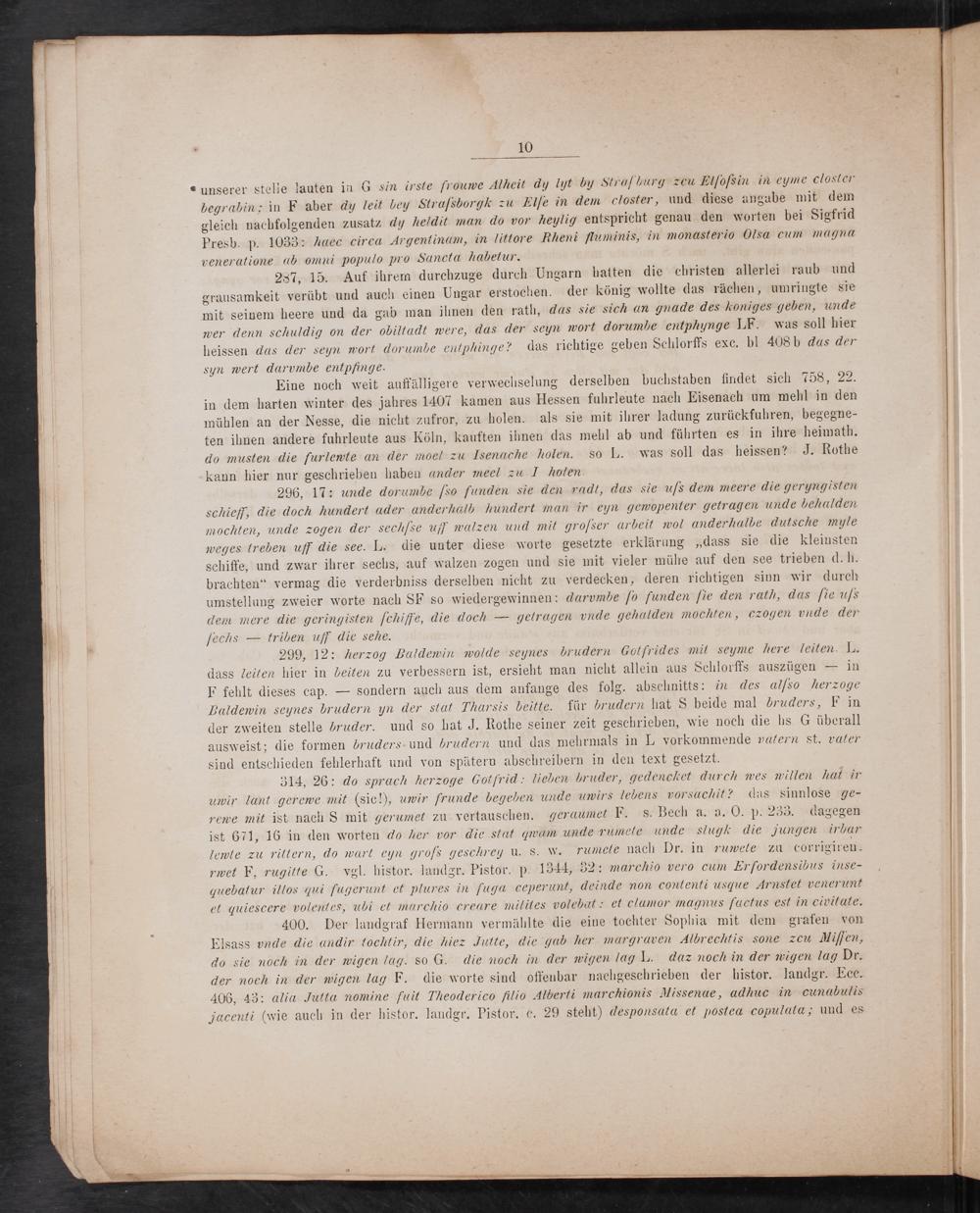 314, 26: do sprach herzoge Gotfrid: lieben bruder, gedencket durch wes willen hat ir awir lant gerewe mit(sie!), uwir frunde begeben unde uwirs lebens vorsachit? das sinnlose ge— rewe mit ist nach S mit gerumet zu vertauschen. geraumet F. s. Bech a. a. O. p. 233. dagegen ist 671, 16 in den worten do her vor die stat Qwum unde rumeèle aunde slugk die Jungen irbar lewte zu rittern, do wart egn groſs geschreg u. s. W. Trumoèle nach Dr. in ruwele zu corrigiren. rwet F, rugitte G. vgl. histor. landgr. Pistor. p. 1344, 32: marchio vero cum Erfordensibus inse- quebatur illos qui fugerunt et plures in fuga ceperunt, deinde non contenti usqdue Arnstet venerunt et quiescere volentes, ubi ek marchio creure milites volebat: et elamor magnus factus est in civilale.
