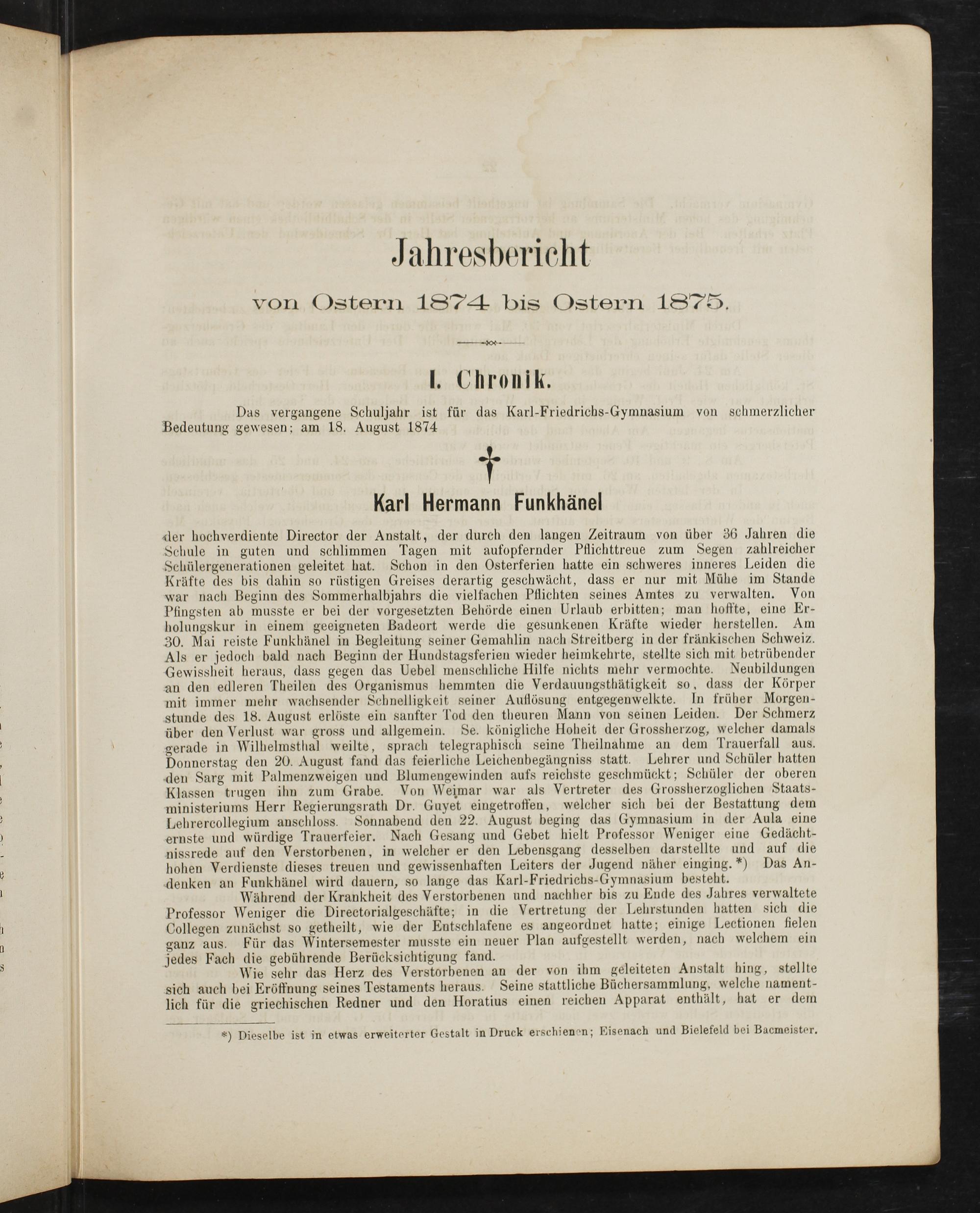 der hochverdiente Director der Anstalt, der durch den langen Zeitraum von über 36 Jahren die Schule in guten und schlimmen Tagen mit aufopfernder Pflichttreue zum Segen zahlreicher Schülergenerationen geleitet hat. Schon in den Osterferien hatte ein schweres inneres Leiden die Kräfte des bis dahin so rüstigen Greises derartig geschwächt, dass er nur mit Mühe im Stande war nach Beginn des Sommerhalbjahrs die vielfachen Pflichten seines Amtes zu verwalten. Von Pfingsten ab musste er bei der vorgesetzten Behörde einen Urlaub erbitten; man hoffte, eine Er- holungskur in einem geeigneten Badeort werde die gesunkenen Kräfte wieder herstellen. Am 30. Mai reiste Funkhänel in Begleitung seiner Gemahlin nach Streitberg in der fränkischen Schweiz. Als er jedoch bald nach Beginn der Hundstagsferien wieder heimkehrte, stellte sich mit betrübender Gewissheit heraus, dass gegen das Uebel menschliche Hilfe nichts mehr vermochte. Neubildungen an den edleren Theilen des Organismus hemmten die Verdauungsthätigkeit so, dass der Körper mit immer mehr wachsender Schnelligkeit seiner Auflösung entgegenwelkte. In früher Morgen- stunde des 18. August erlöste ein sanfter Tod den theuren Mann von seinen Leiden. Der Schmerz über den Verlust war gross und allgemein. Se. königliche Hoheit der Grossherzog, welcher damals gerade in Wilhelmsthal weilte, sprach telegraphisch seine Theilnahme an dem Trauerfall aus. Donnerstag den 20. August fand das feierliche Leichenbegängniss statt. Lehrer und Schüler hatten den Sarg mit Palmenzweigen und Blumengewinden aufs reichste geschmückt; Schüler der oberen Klassen trugen ihn zum Grabe. Von Weimar war als Vertreter des Grossherzoglichen Staats- ministeriums Herr Regierungsrath Dr. Guyet eingetroffen, welcher sich bei der Bestattung dem Lehrercollegium anschloss. Sonnabend den 22. August beging das Gymnasium in der Aula eine ernste und würdige Trauerfeier. Nach Gesang und Gebet hielt Professor Weniger eine Gedächt- nissrede auf den Verstorbenen, in welcher er den Lebensgang desselben darstellte und auf die hohen Verdienste dieses treuen und gewissenhaften Leiters der Jugend näher einging.*) Das An- denken an Funkhänel wird dauern, so lange das Karl-Friedrichs-Gymnasium besteht.