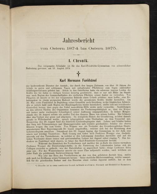 Das vergangene Schuljahr ist für das Karl-Friedrichs-Gymnasium von schmerzlicher Bedeutung gewesen; am 18. August 1874