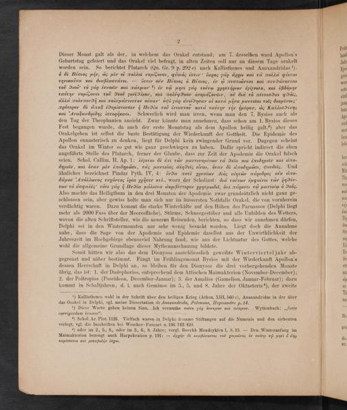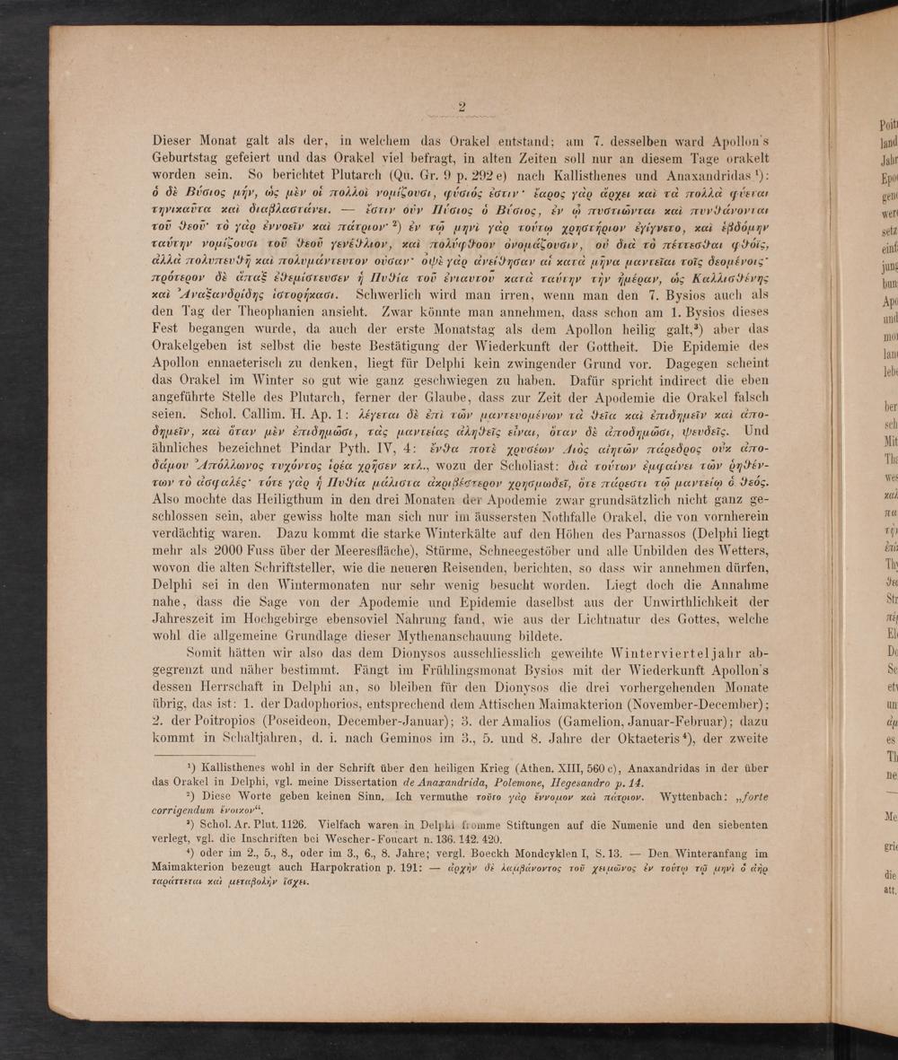 Dieser Monat galt als der, in welchem das Orakel entstand; am 7. desselben ward Apollon's Geburtstag gefeiert und das Orakel viel befragt, in alten Zeiten soll nur an diesem Tage orakelt worden sein. So berichtet Plutarch(Qu. Gr. 9 p. 292 e) nach Kallisthenes und Anaxandridas ¹): d ds Bu*αοs ̈ν, ᷣ ̈νν o τοον οευουνσν, ρ2σανς ⁸σντιε ⁵αos do doxe œ τ ld gεera rivixxẽe u dια‿‿ανdᷣeννε.— 2Gνν ο⁴mφ HHũαοο BLανοο, sv rvœriνᷣνταν ταα π⁵σένονεα roõ Soꝑ τ⁴ ας suvostn za—πα⁵εοσ) S" 1ᷣ& ν αm˙ roνιν 1070JOuo» grirvsro, 2αm⁴⁹⁴⁶ν rœννπmνν νονοιιοοισιιι τον ϑ⸗ον ενν̈μον, noligooor ońovoiy, 00 d τ πιτεεεαισιι φis, ³ τυsu acl 2obisyT2bz 00Gy: 0%8 ya IeiννGσœeν l‿ απασατ asva Weeeee, roĩεs dsπι⁵ιέινοιςι rorεοον s dnαs εdεuνgtsuoes Iudiæ roν νœνod crd raαννπmmν ετμν ñεμεοαν σ Kæεένν⁸ αeναάνσοidα εστιοοσνmάάηιασ. Schwerlich wird man irren, wenn man den 7. Bysios auch als den Tag der Theophanien ansieht. Zwar könnte man annehmen, dass schon am 1. Bysios dieses Fest begangen wurde, da auch der erste Monatstag als dem Apollon heilig galt,²) aber das Orakelgeben ist selbst die beste Bestätigung der Wiederkunft der Gottheit. Die Epidemie des Apollon ennaeterisch zu denken, liegt für Delphi kein zwingender Grund vor. Dagegen scheint das Orakel im Winter so gut wie ganz geschwiegen zu haben. Dafür spricht indirect die eben angeführte Stelle des Plutarch, ferner der Glaube, dass zur Zeit der Apodemie die Orakel falsch seien. Schol. Callim. H. Ap. 1: 76yε(τμαι—ꝛ mπ⁷0„G‚"v„ αeντνοέ̈ναωανετ Sdsiu œ επιιμιεμν αα mQπο- d-uεεmν, axꝭ oard εν ετμ⁶ινμάμυν, d αereido dz⁵εs siwu, öra ds dντοοτάιν, ενde. Und aàhnliches bezeichnet Pindar Pyth. IV, 4: 2ν%πα mπποτά☚ ουιον dς éνν ταοεdοοσςσ ονν αroo ddυμάο̈MG dr röaυeνοο νυνντοs oεέα αμρν νι⁴d., wozu der Scholiast: d τοιντπιιεεμιμφ⁵α☚έᷣ ει τνν ιεέν 10ν 1 dοαεςα örs do Iνοin μσνα dᷣονεεέασανκον◻νρνυωιμιμdsε, Jre r⁴οεστιν τ¶ μꝛvwuUε ss. Also mochte das Heiligthum in den drei Monaten der Apodemie zwar grundsätzlich nicht ganz ge- schlossen sein, aber gewiss holte man sich nur im äussersten Nothfalle Orakel, die von vornherein verdächtig waren. Dazu kommt die starke Winterkälte auf den Höhen des Parnassos(Delphi liegt mehr als 2000 Fuss über der Meeresfläche), Stürme, Schneegestöber und alle Unbilden des Wetters, wovon die alten Schriftsteller, wie die neueren Reisenden, berichten, so dass wir annehmen dürfen, Delphi sei in den Wintermonaten nur sehr wenig besucht worden. Liegt doch die Annahme nahe, dass die Sage von der Apodemie und Epidemie daselbst aus der Unwirthlichkeit der Jahreszeit im Hochgebirge ebensoviel Nahrung fand, wie aus der Lichtnatur des Gottes, welche wohl die allgemeine Grundlage dieser Mythenanschauung bildete.