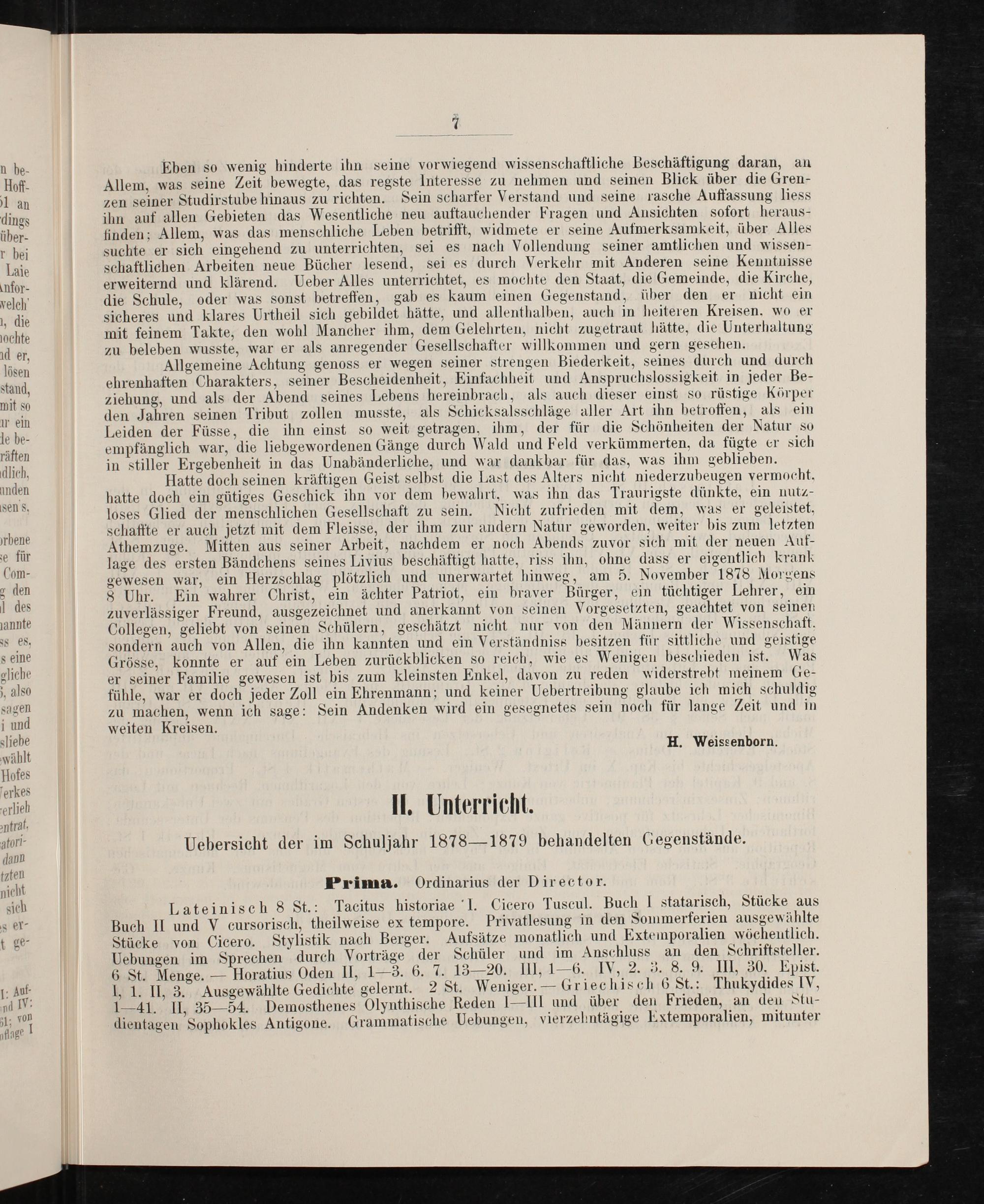 Lateinisch s St.: Tacitus historiae I. Cicero Tuscul. Buch I statarisch, Stücke aus Buch II und V cursorisch, theilweise ex tempore. Privatlesung in den Sommerferien ausgewählte Stücke von Cicero. Stylistik nach Berger. Aufsätze monatlich und Extemporalien wöcheutlich. Uebungen im Sprechen durch Vorträge der Schüler und im Anschluss an den Schriftsteller. 6 St. Menge.— Horatius Oden II, 1—3. 6. 7. 13—20. III, 1—6. IY 3 2. 3. 8. 9. III, 30. Epist. I, 1. II, 3. Ausgewählte Gedichte gelernt. 2 St. Weniger.— Griechisch 6 St.: Thukydides IV, 1— 41. II, 35— 54. Demosthenes Olynthische Reden- III und über den Frieden, an den Stu- dientagen Sophokles Antigone. Grammatische Uebungen, vierzehntägige Extemporalien, mitunter