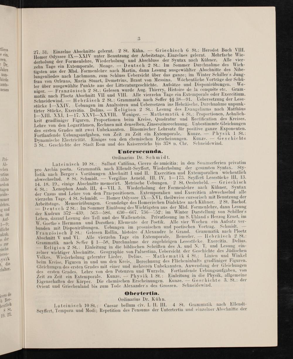 Ordinarius Dr. Kühn. Lateinisch 10 St.: Caesar bellum civ. I. II. II. 4 St. Grammatik nach Ellendt- Seyffert, Tempora und Modi; Repetition des Pensums der Untertertia und einzelner Abschnitte der